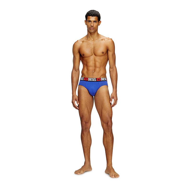 Three-pack of briefs in stretch cotton. The soft jacquard waistband is woven all-over with the Diesel logo and Denim Division D emblem.