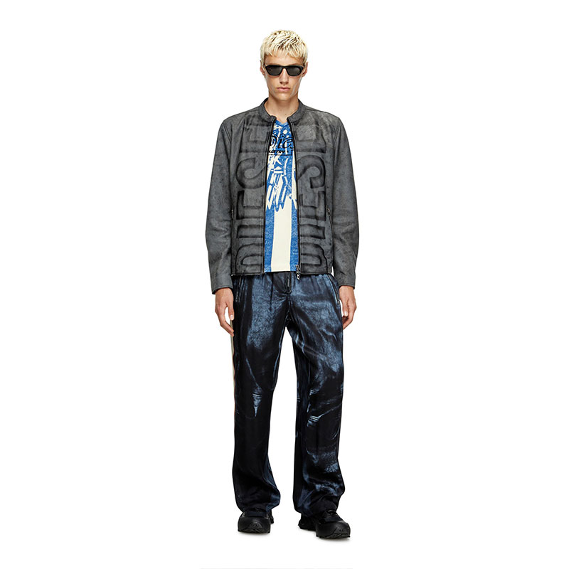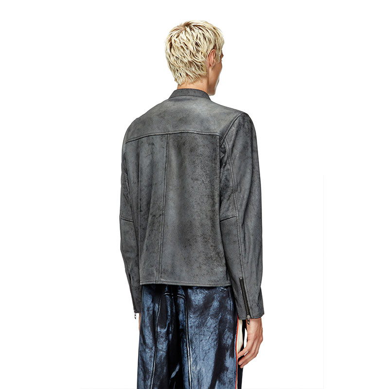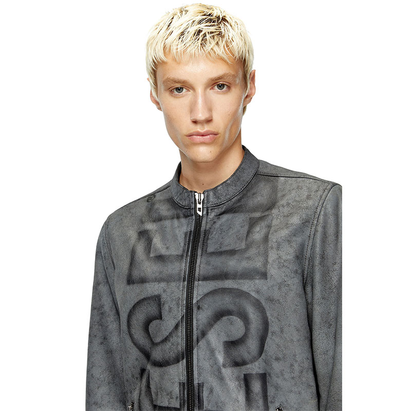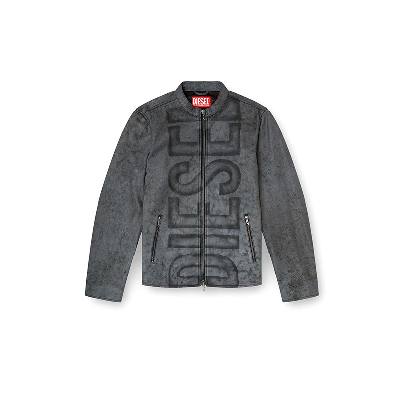 Men's biker jacket with a regular-fit racer silhouette. Crafted from responsibly sourced leather, this treated style has an irregular, marbled appearance and a faded out Diesel Superlogo blasted vertically down the front. It's lined for comfort and detailed with chunky zipped hardware with D logo pulls.