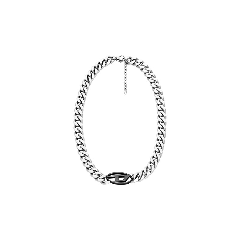 Diesel's two-tone chain necklace features a stainless steel silver curb chain and the iconic Oval D logo in black.