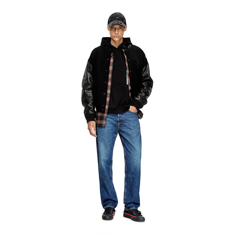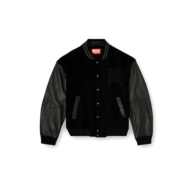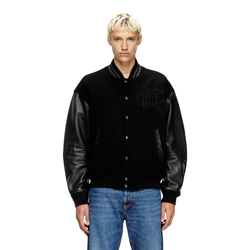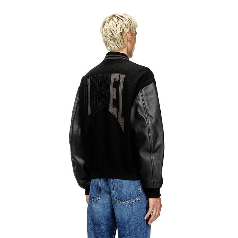 Men's cotton bomber jacket, featuring leather sleeves and striped ribbed trims. Varsity logo motifs on the chest and back add a tactile note.
