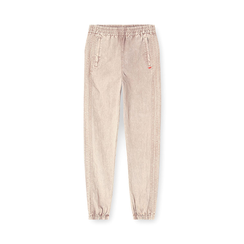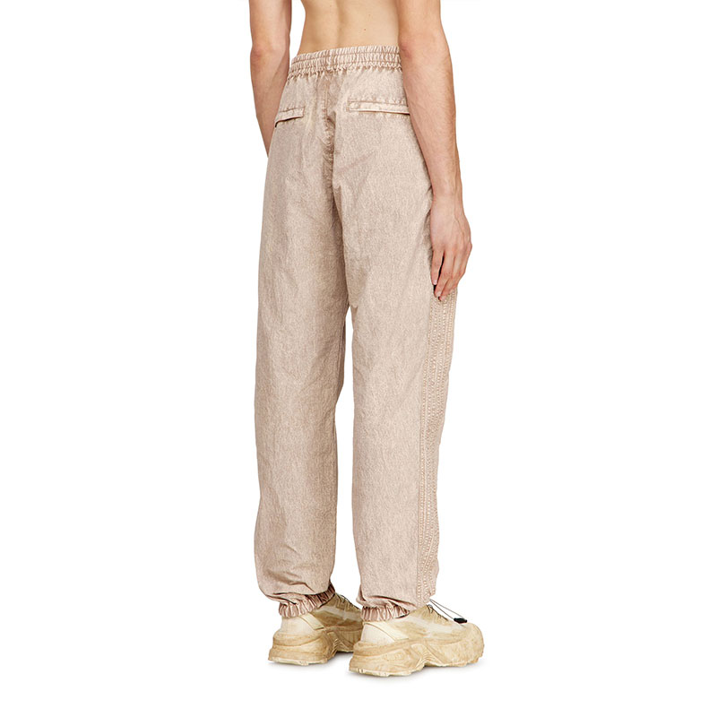 Regular-fit men's trousers made from treated nylon, featuring a garment-dyed and snow-wash finish for a nuanced look, and band details along the sides. Front and back pockets are finished with Diesel zip pullers, while a silicon D patch accents the front for a distinctive touch.