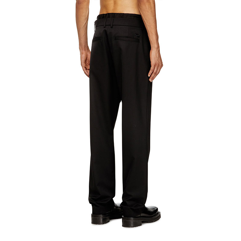 Regular fit wool blend trousers. They feature a comfortable elastic waistband with contrasting nylon belt and drawstring closure, complemented by a zipper, a four-hole button, and an internal hook. The front pockets and the welt pockets on the back add an elegant touch, further enhanced by the back metal plate with Oval D logo.