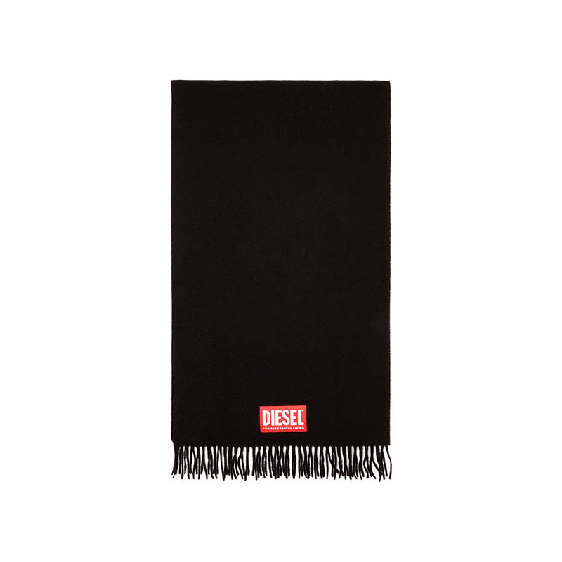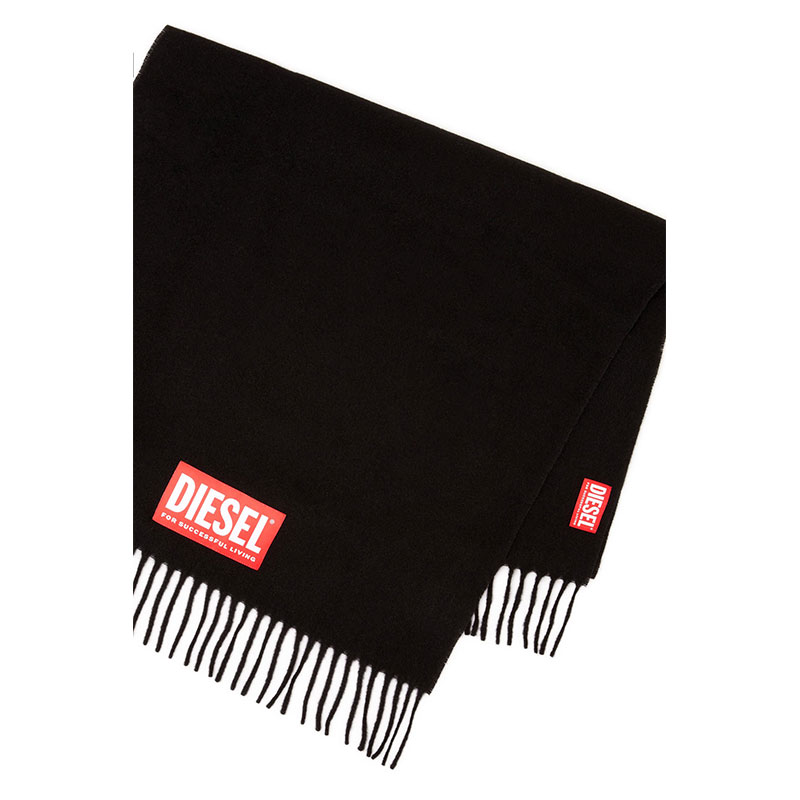 This classic men's wool jacquard scarf is finished with long fringe trims. A Diesel for Successful Living logo patch is placed at the bottom.