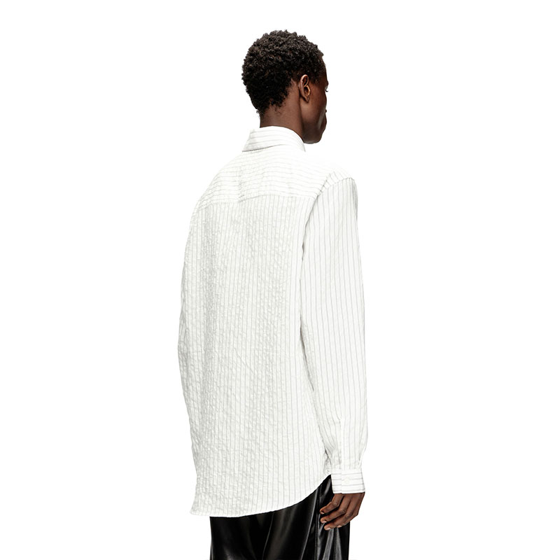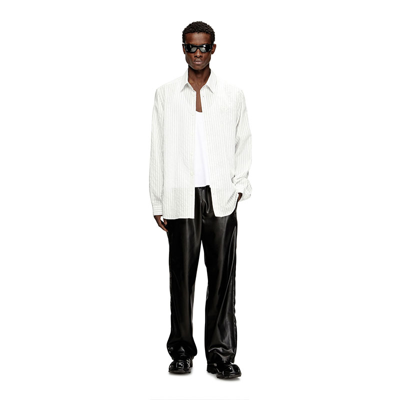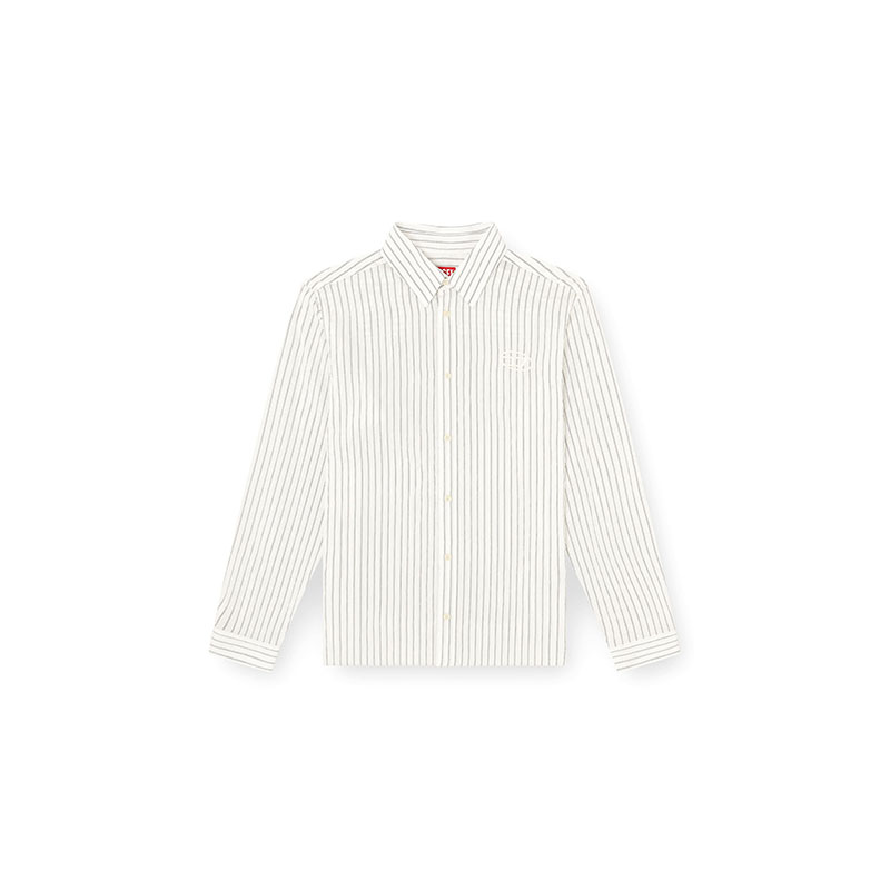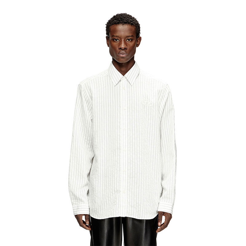 Long-sleeve shirt made from a modal, nylon and cupro blend, offering a fluid and lightweight feel. The fabric features a vertically striped motif, enhancing a modern and sophisticated design. Fastens with 4-hole buttons on the front and cuffs. The distinctive element is the Oval D logo embroidery on the left chest, adding an iconic touch to the garment.