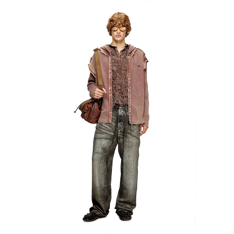 This men's full-zip hoodie features a destroyed peel-off effect. Made from organic cotton, it has ribbed-knit sleeves and a double-layer jersey body, its outer slashed and hollowed out, leaving jagged remnants of the fabric. The garment-dyed brown hue looks utterly laid back. Complete with an embroidered Oval D logo on the chest.
