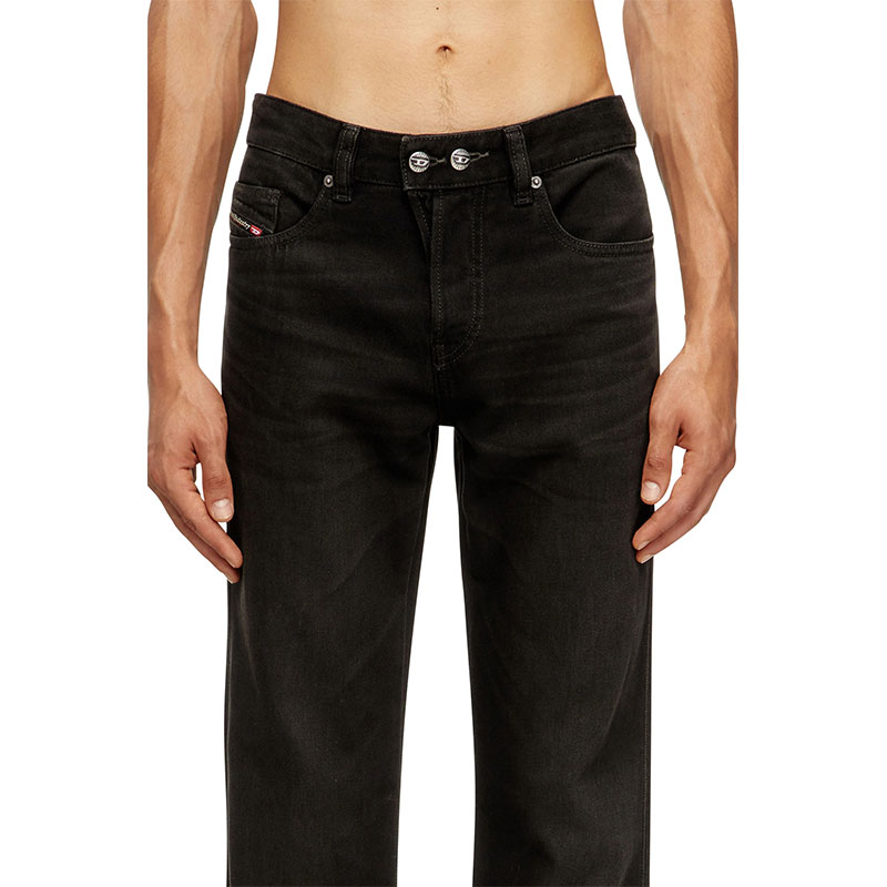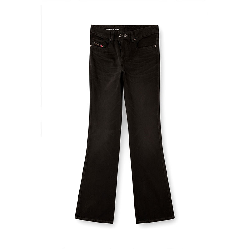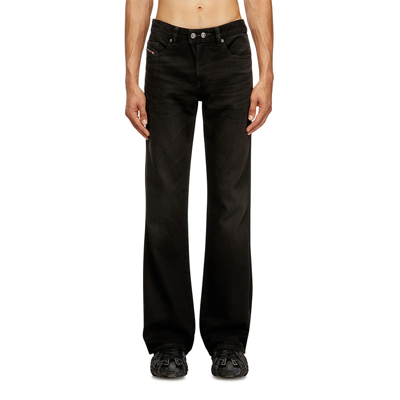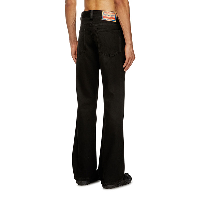 Bootcut fit with a medium waist, low crotch, and regular leg. The extra-long silhouette has a slightly flared hem and is detailed with an embroidered "D". Button fly.