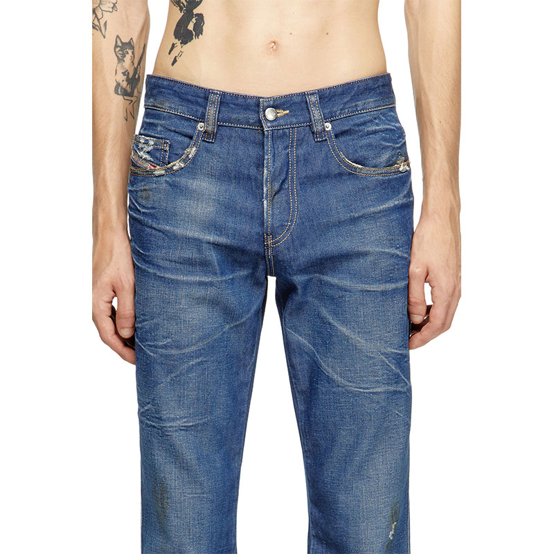 This fix denim is made using organic cotton and recycled polyester fibres. The dark blue wash embodies Diesel's DNA through Distressed in Italy treatments, including 3D whiskers and localised dirt effects.