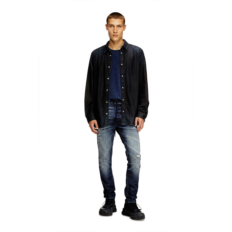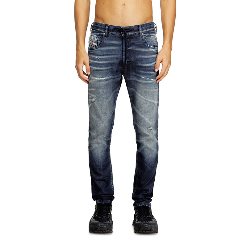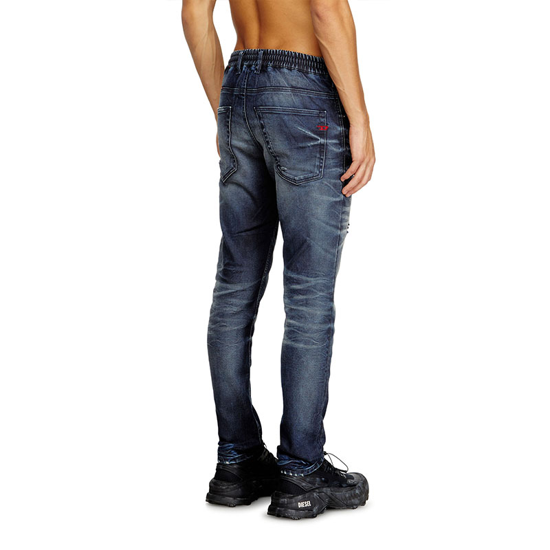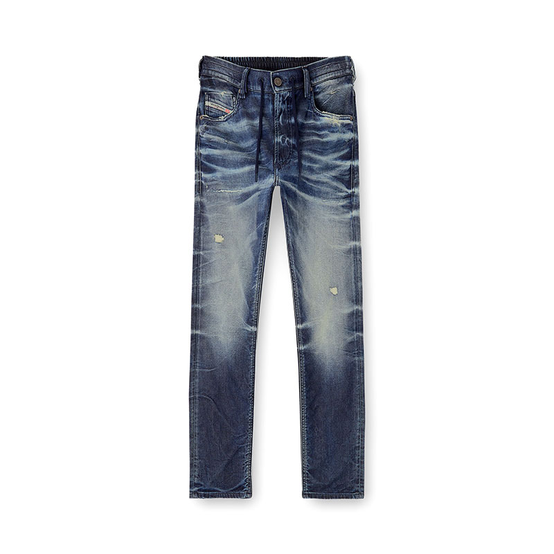The dark blue wash celebrates Diesel’s DNA with a treated look that's skillfully engineered to stand out, blending innovative comfort with authentic character. Hand-shaped 3D creases and abrasions add texture, while manually sanded whiskers with distinctive pinched details enhance the lived-in look. Made with 60% organic cotton.