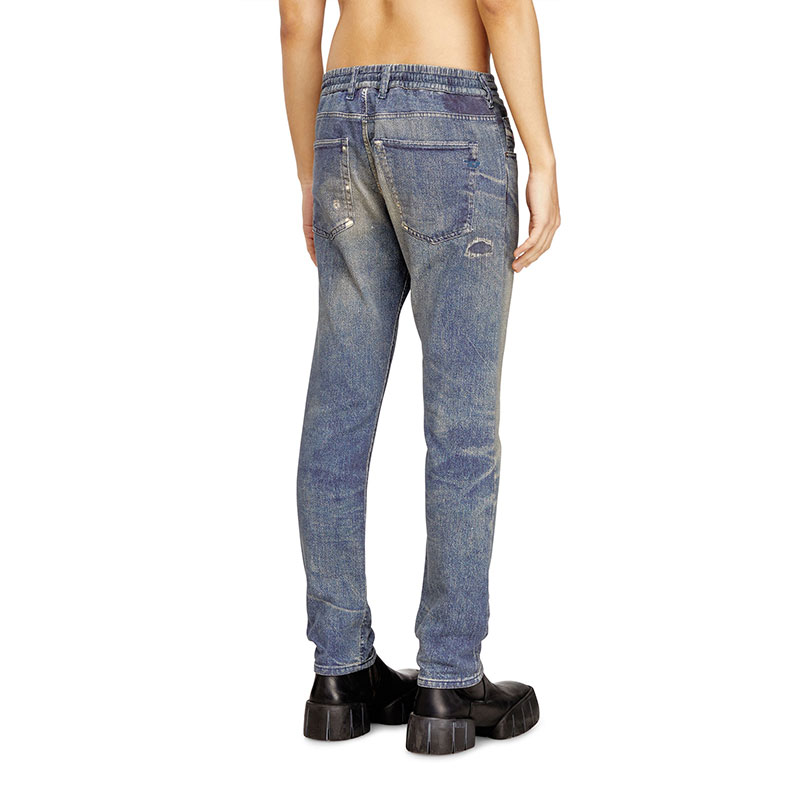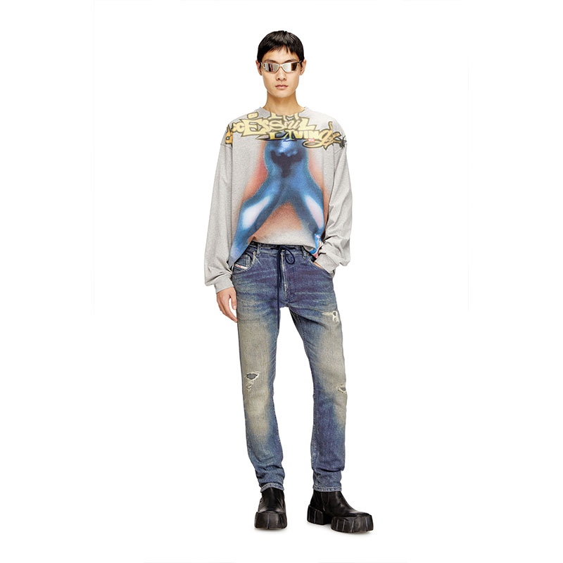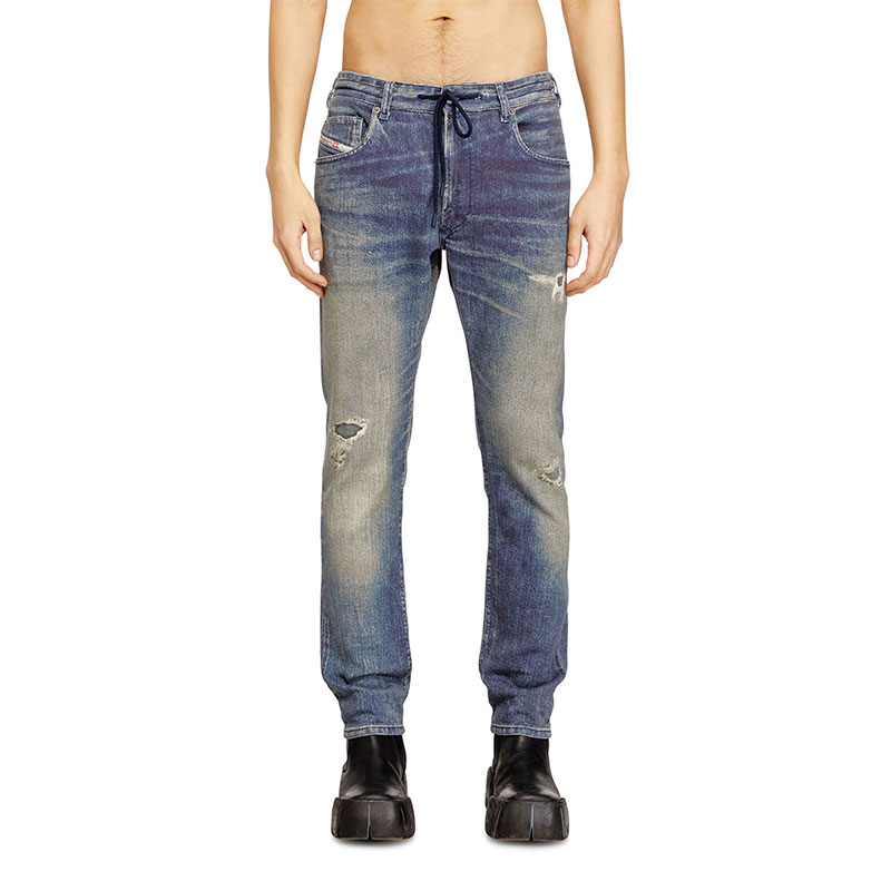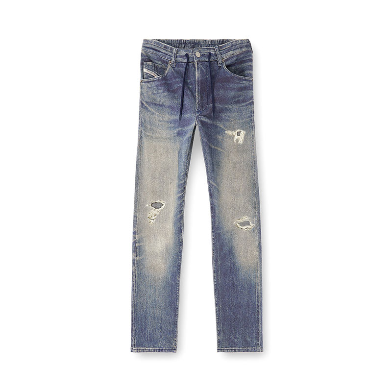 A DNA look with signature treatments, this medium blue wash is detailed with printed abrasions and whiskers for a distinctive trompe l'oeil look. Crafted with a percentage of recycled cotton.