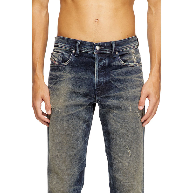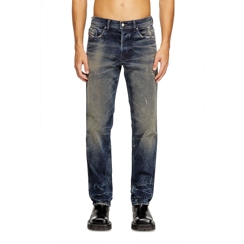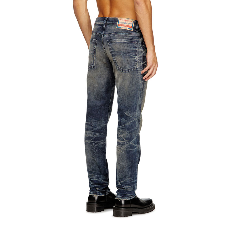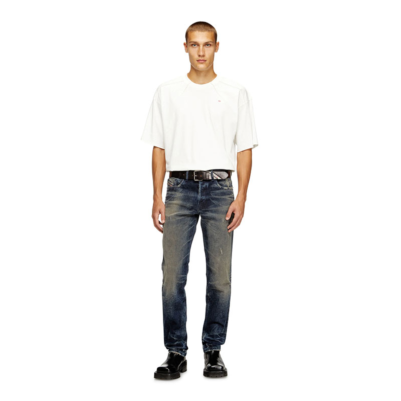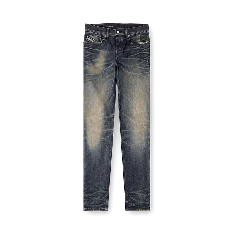 Representing the soul of Diesel denim, this dark blue wash is defined by an impactful combination of exclusive treatments: bold 3D whiskers, abrasions and irregular shading create a gritty, lived-in look, enhanced by a dirty-dusty finish. A key piece in Diesel's DNA collection, it's entirely Distressed in Italy.