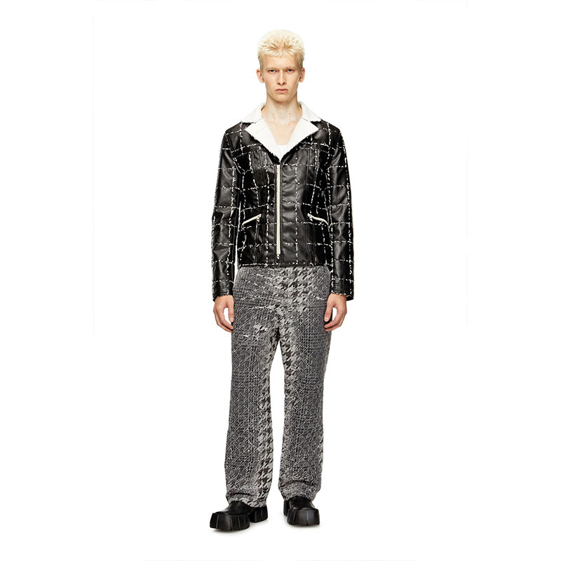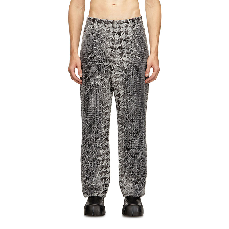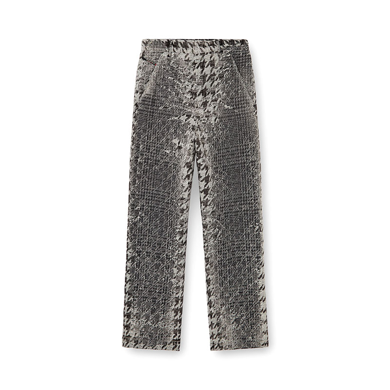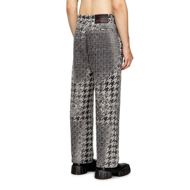 Distressed in Italy, this black fix denim features a distinctive jacquard weave with a double pattern: the houndstooth top layer is burned using a precise laser process to reveal the Prince of Wales motif underneath. Stonewashed with enzymes, this unique worn-in wash is part of the Runway line up, channelling an unconventional haute-couture attitude.