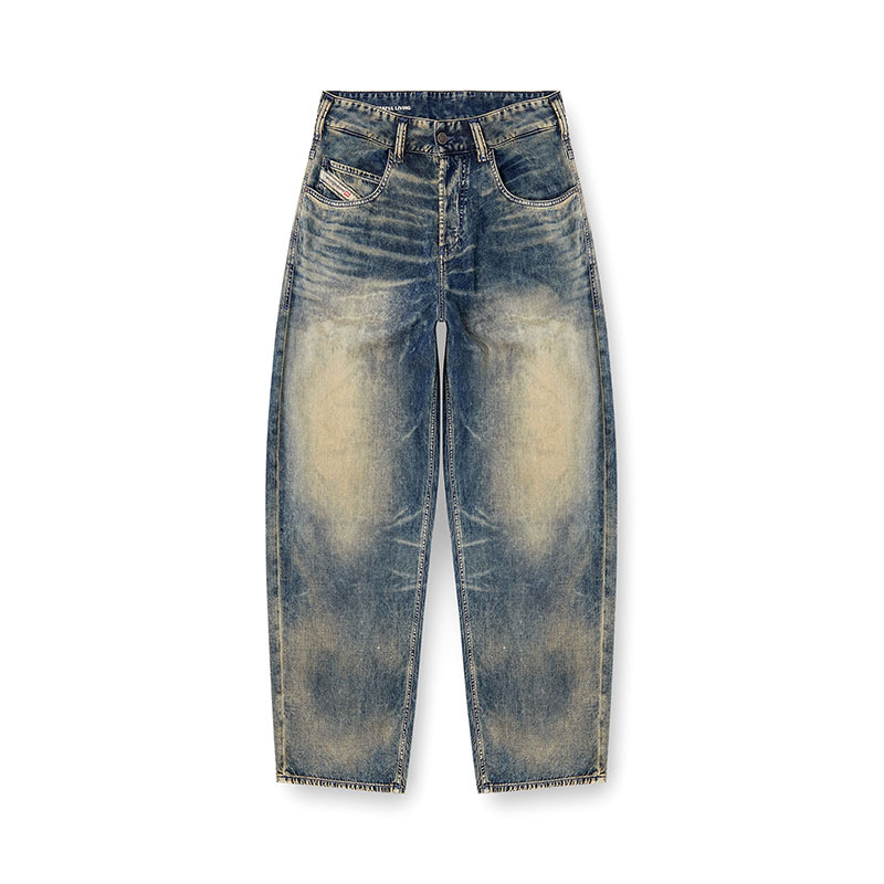 This medium blue wash reinterprets Diesel's heritage coating with a subtle, contemporary twist. The fix denim base is made from a fluid Lyocell and Modal blend, stone washed and treated with bleach effects for a marbled finish. A special transparent film is pressed on the fabric, creating an extremely refined, soft coated finish.