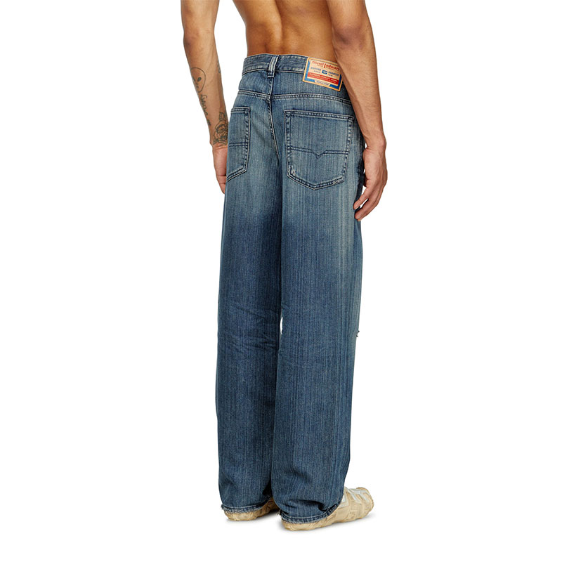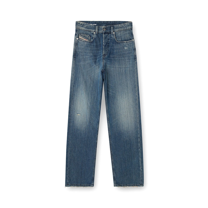 Crafted using regenerative cotton, this fix denim showcases a bold streaky effect, enriched by whiskering and small abrasions for a distinctive worn look.