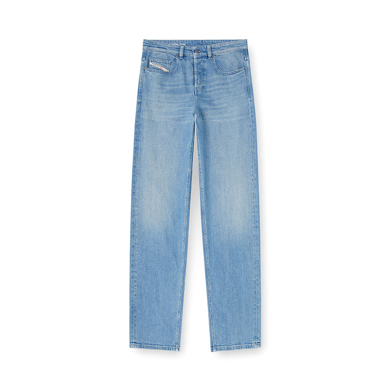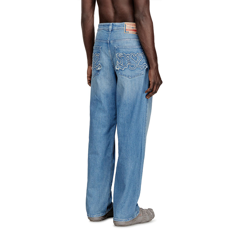 Crafted from fix denim in medium blue, this distinctive wash is enriched with sparkling micro stones on the front and an embroidered patch on the back pockets.