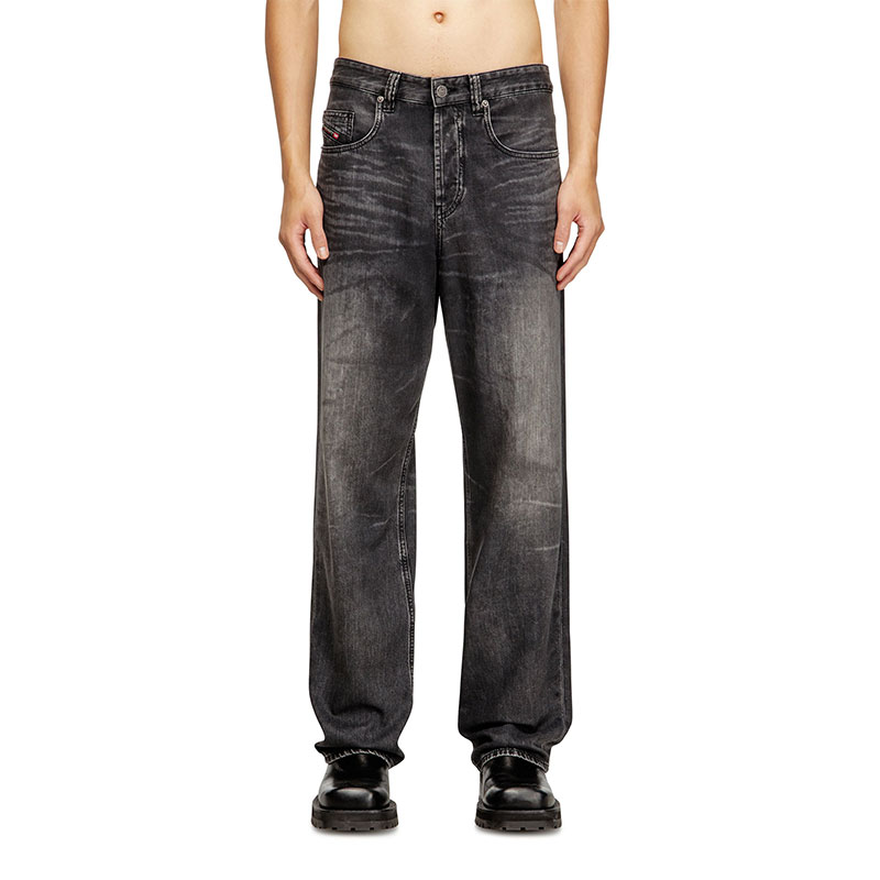 This black wash reinterprets Diesel's heritage coating with a subtle, contemporary twist. The fix denim base is made from a fluid Lyocell and Modal blend, stone washed and treated with bleach effects for a marbled finish. A special transparent film is pressed on the fabric, creating an extremely refined, soft coated finish.