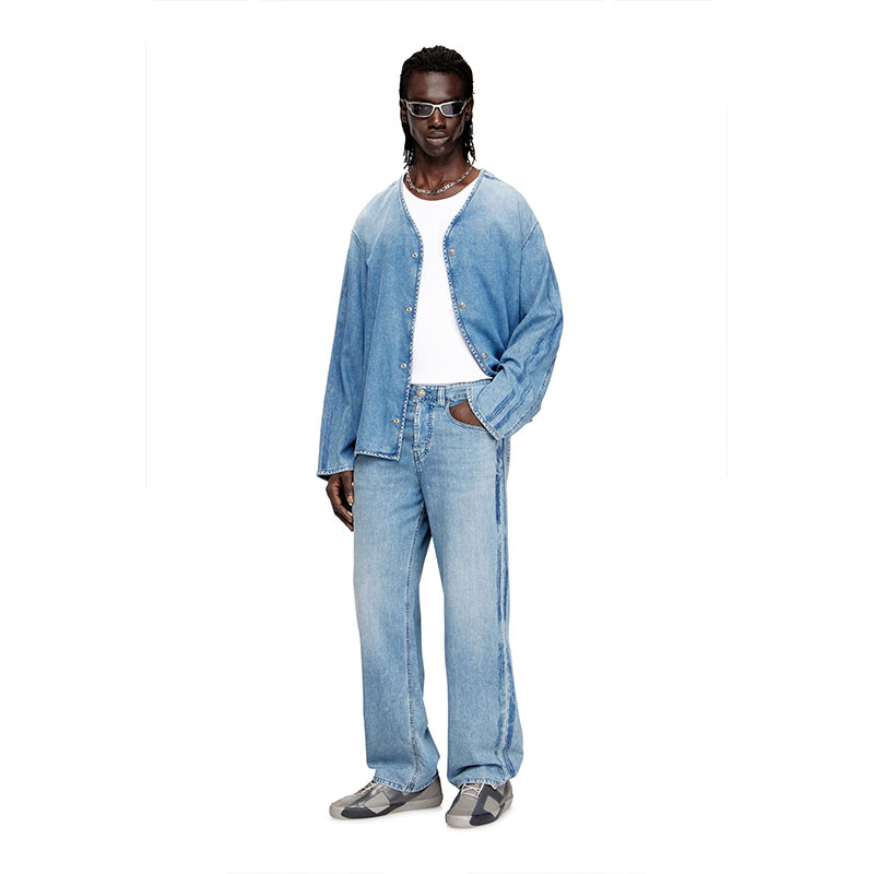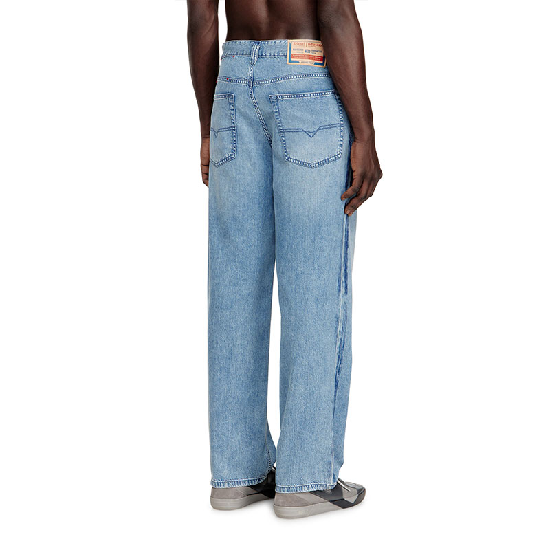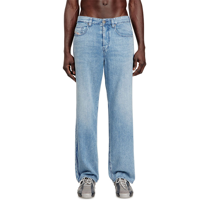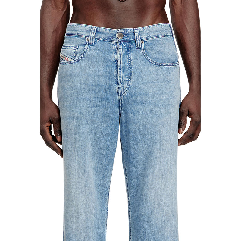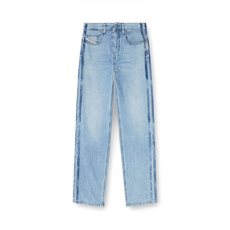 The stonewashed medium blue fix denim is crafted from organic cotton and TENCEL Lyocell for a lightweight feel. Athletic raised side bands, enriched with an additional printed stripe, add a dynamic touch. The "Property of Diesel" print is a signature detail.