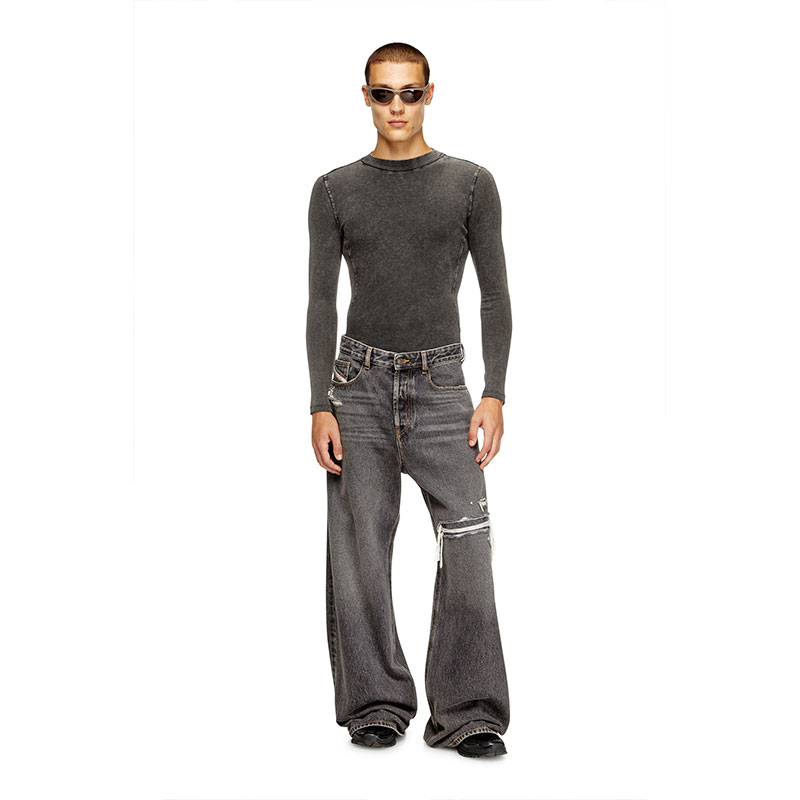 This fix denim delivers a destroyed look. The organic cotton fabric in dark grey is treated with an alternative stonewash technique and detailed with cuts and abrasions.