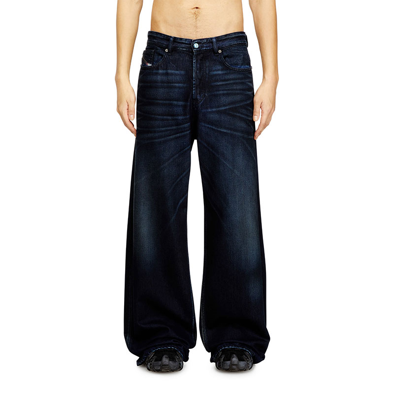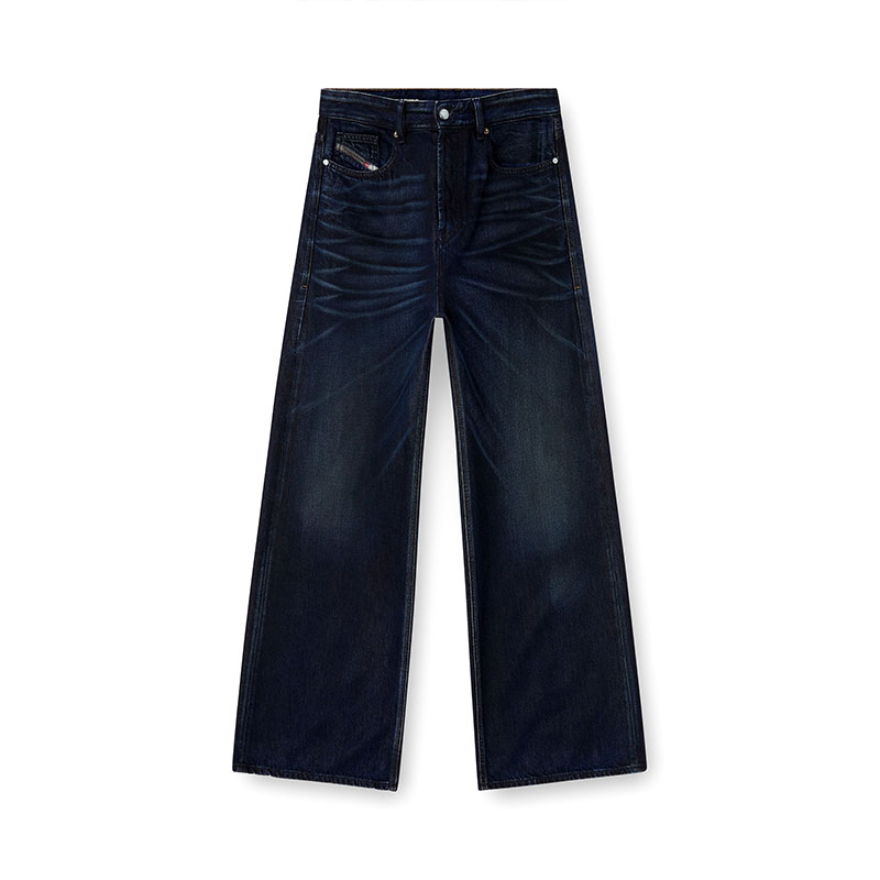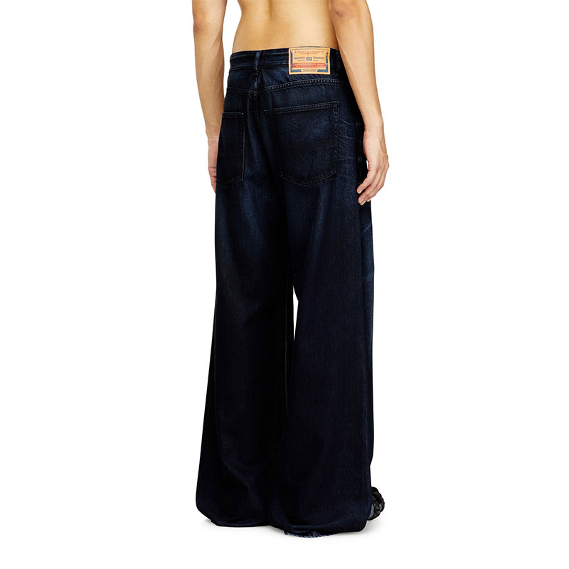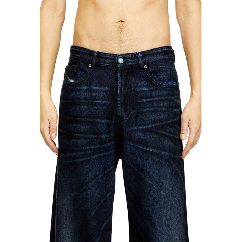 Characterised by intense variations in tone achieved through artisanal treatments, this dark blue wash is part of Diesel's DNA selection, offering an iconic take on the brand's heritage denim. It's made from fix fabric with organic cotton and TENCEL Lyocell, with a soft, fluid fit. Boldly contrasting whiskers are hand-sanded on each garment, while black earth pigments and spray techniques lend a dirt-like finish, enhancing depth and texture.