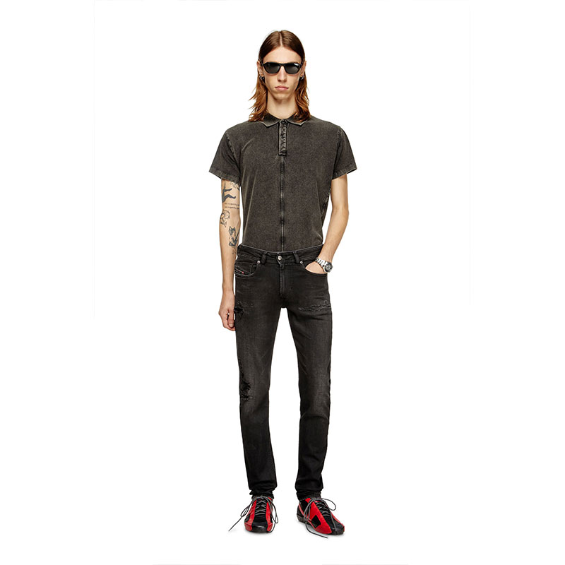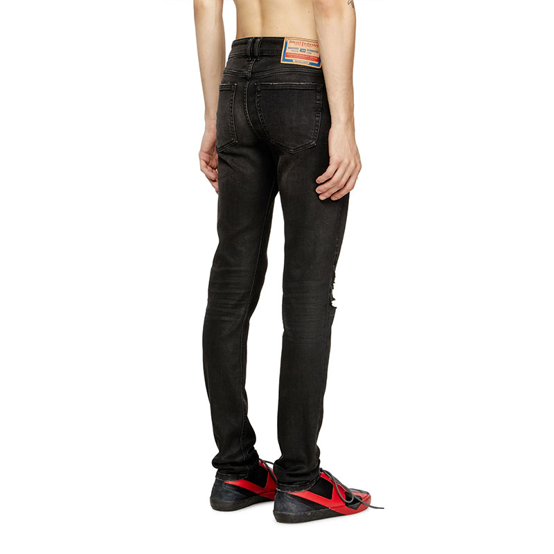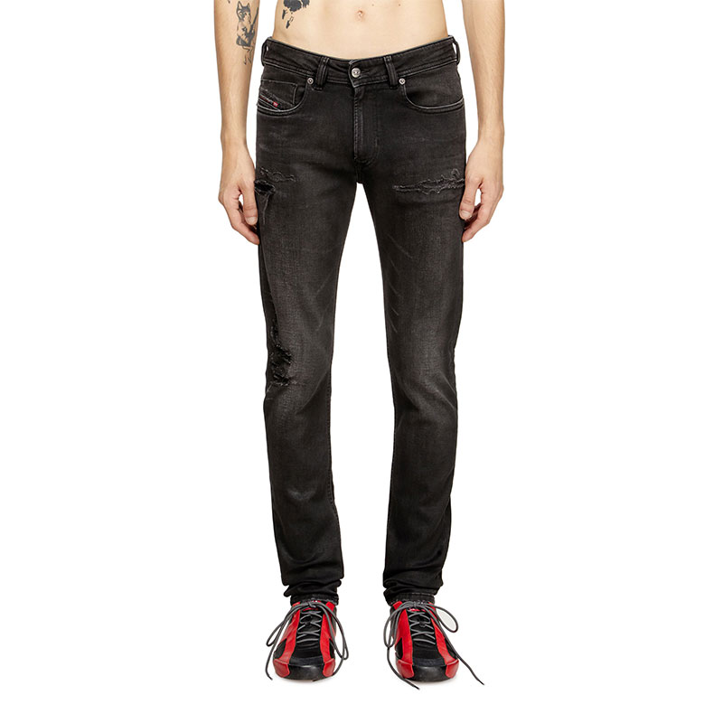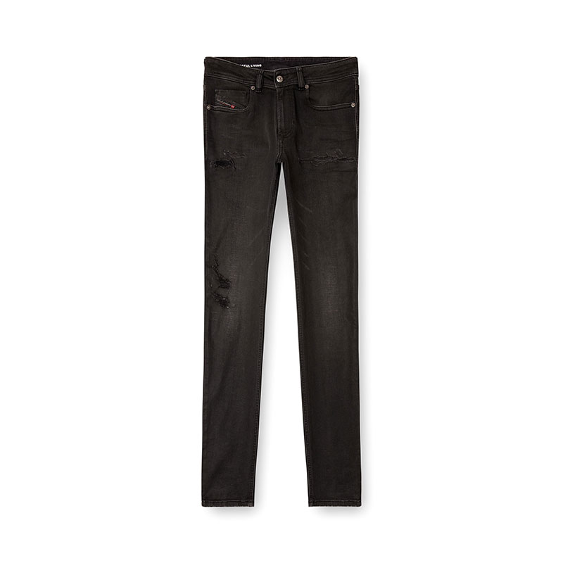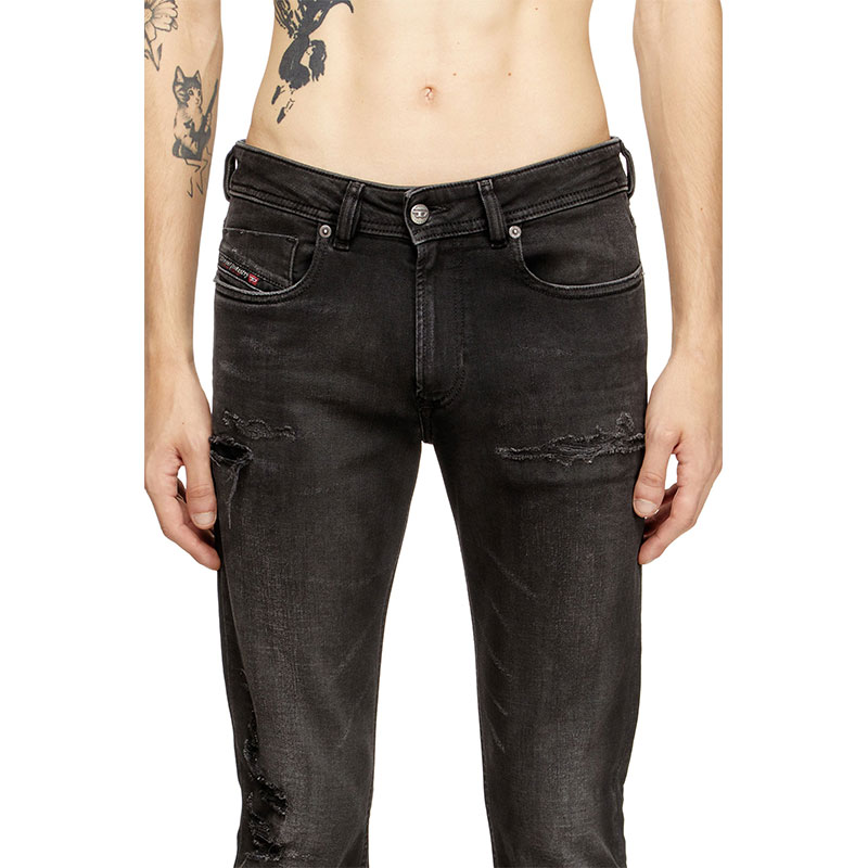Crafted from stretch denim, this DNA wash is an example of Diesel's iconic destroyed aesthetic. It's characterised by bold ripped and repaired abrasions below the pockets and on the knee.