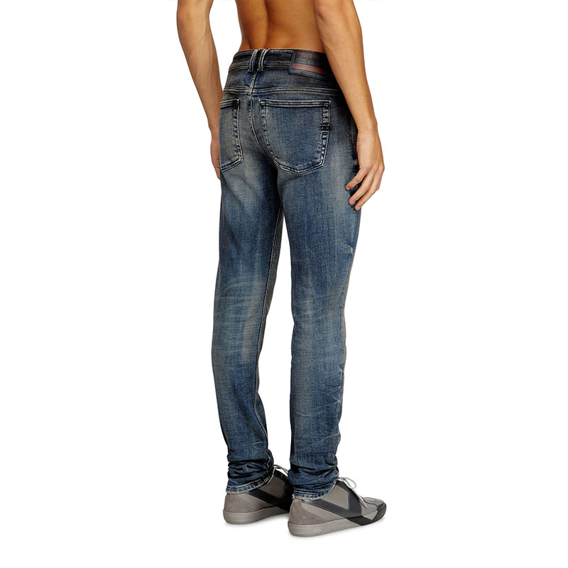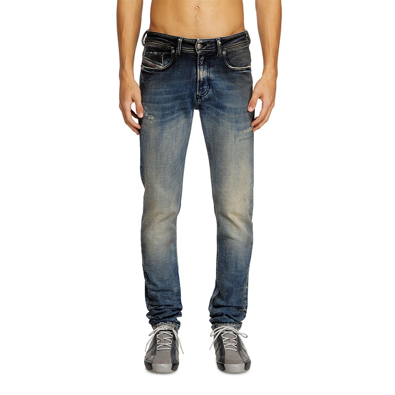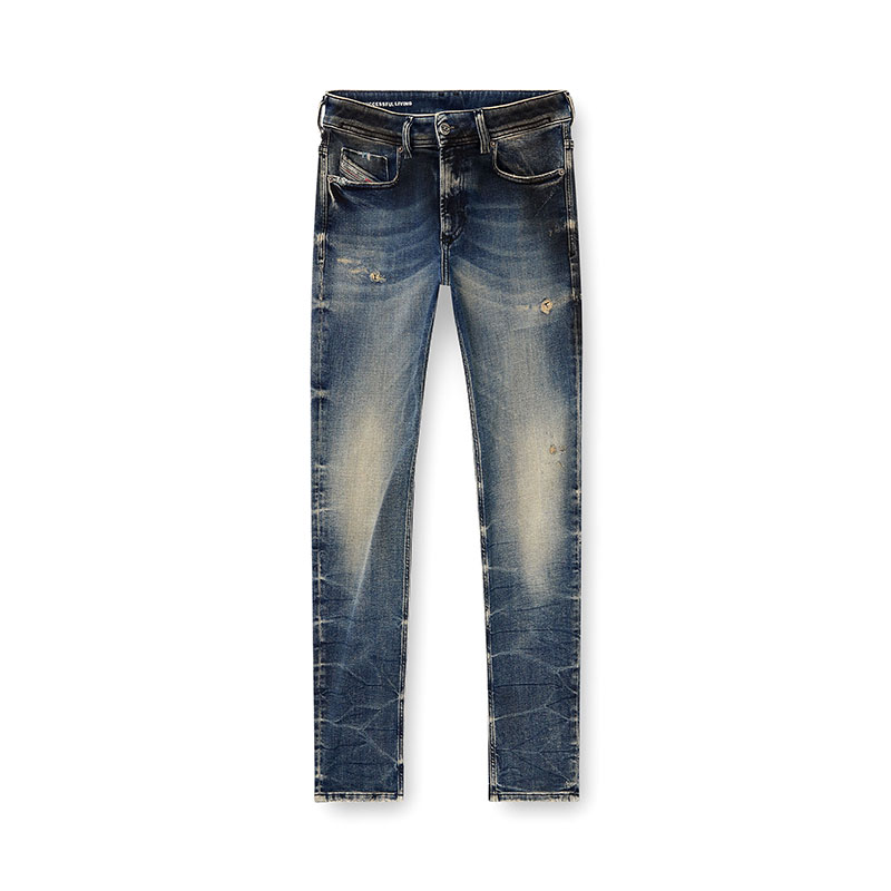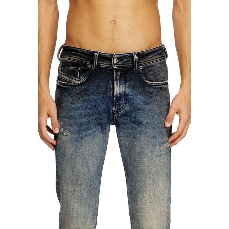 True to Diesel's experimental vision, this medium blue wash showcases innovative binding and dirt techniques that lend the piece depth and character. Crafted from stretch denim in organic cotton, it features hand-sanded whiskers and manual abrasions, with each rip carefully hand-trimmed for a cleaner finish. A black pigment spray creates a unique smudged effect. Finished with a real leather back patch, it’s part of the DNA selection of iconic and heritage washes.