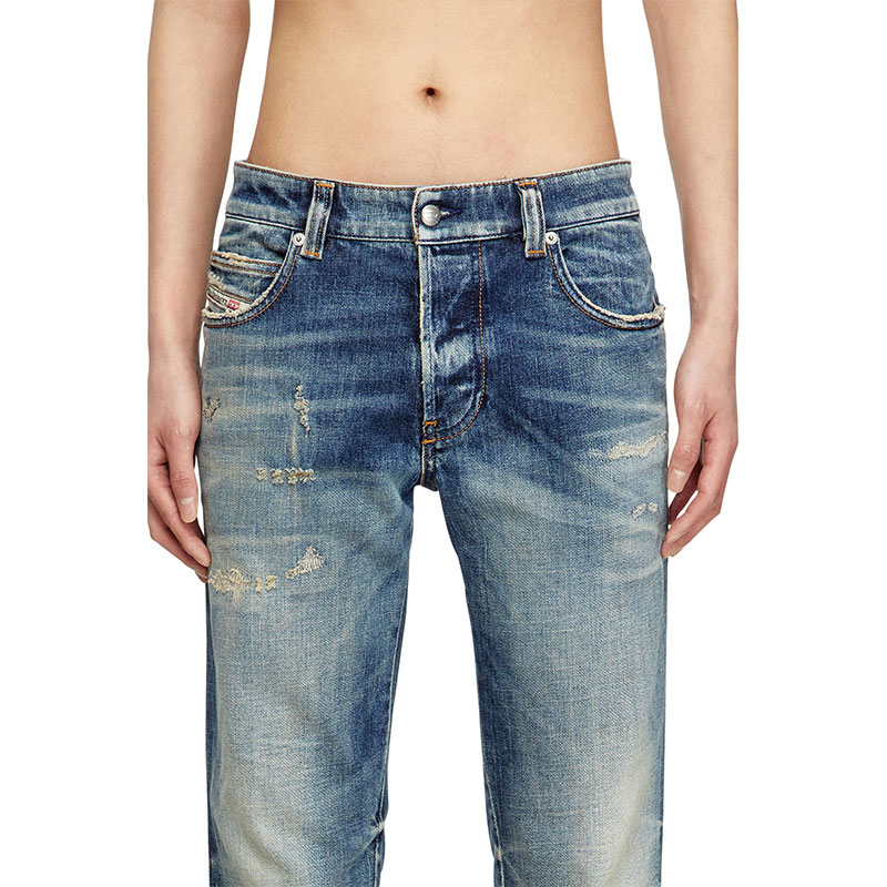 Tapping Diesel's signature destroyed and dirt-infused aesthetic, this dark blue comfort denim is defined by ripped and repaired abrasions, shaded whiskers, and an overall dusty finish. It's made using a percentage of regenerative cotton.