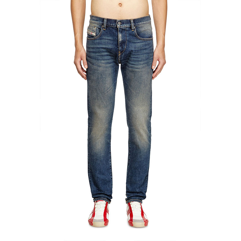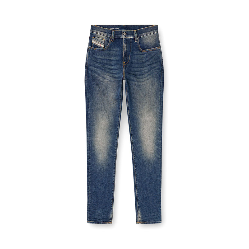 Crafted using regenerative cotton, this comfort denim is lightly treated with whiskers and shaded areas on a dark blue base, delivering an authentic used look.