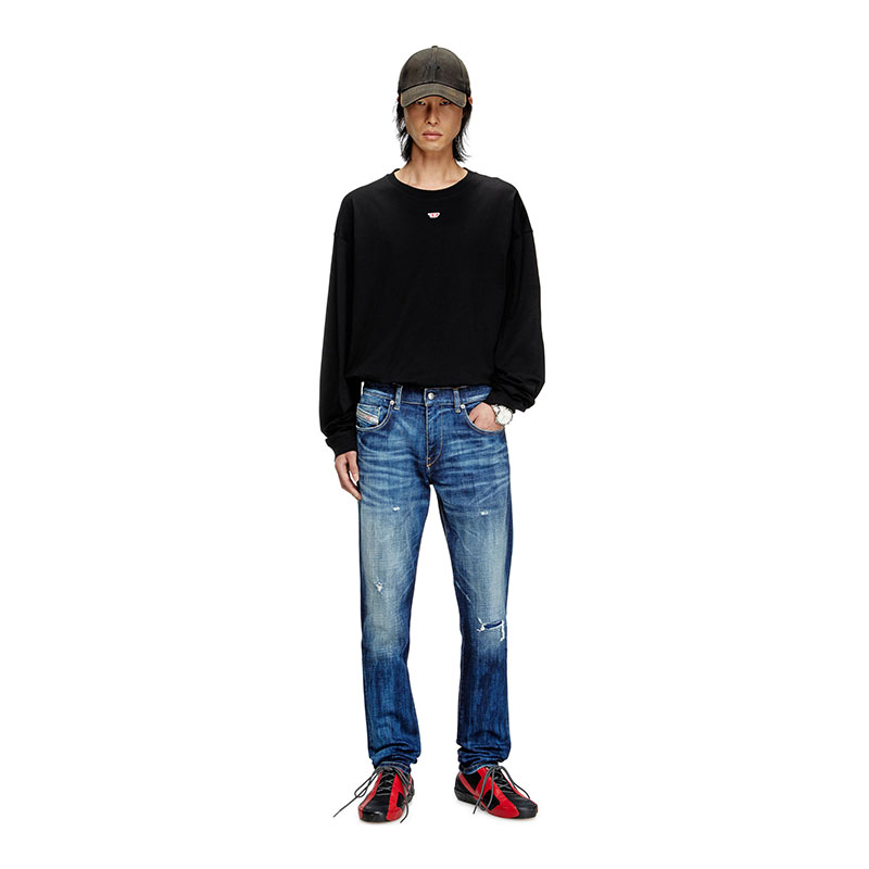 This comfort denim is made using partially recycled cotton. The dark blue wash showcases a signature DNA look, with boldly contrasting whiskers and small abrasions throughout the leg. A ripped and repaired slash on the left knee.