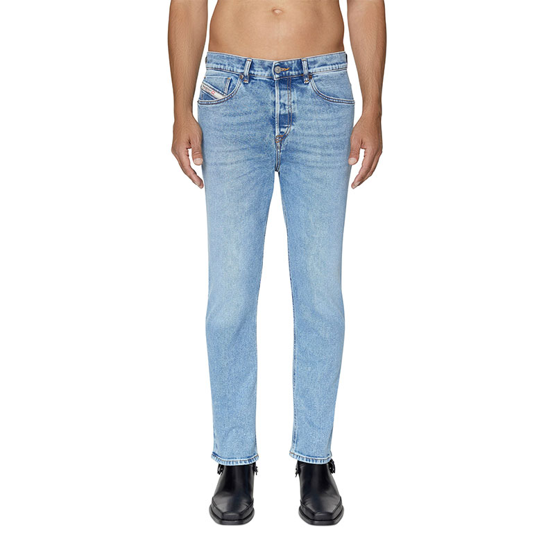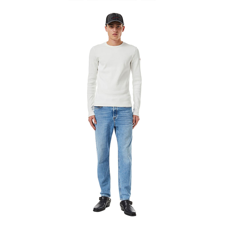 Exuding a vintage vibe, this stretch denim showcases a nuanced medium blue hue enriched with dirt effects.