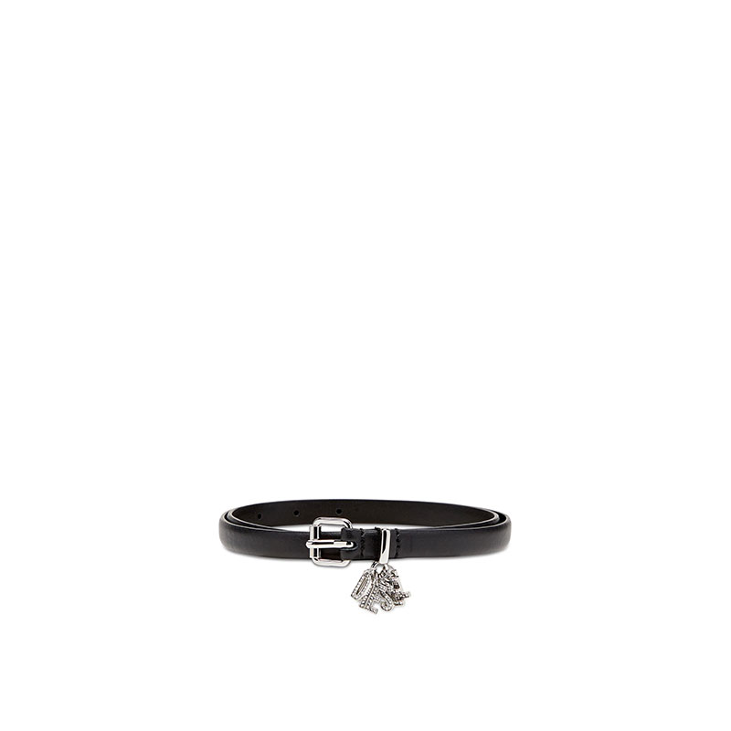 Cut in a slim width, this women’s belt is crafted from responsible leather and fastened with a polished silver roller buckle. The metal logo letter charms dangling from the loop have been bedecked with crystals for a touch of sparkle.