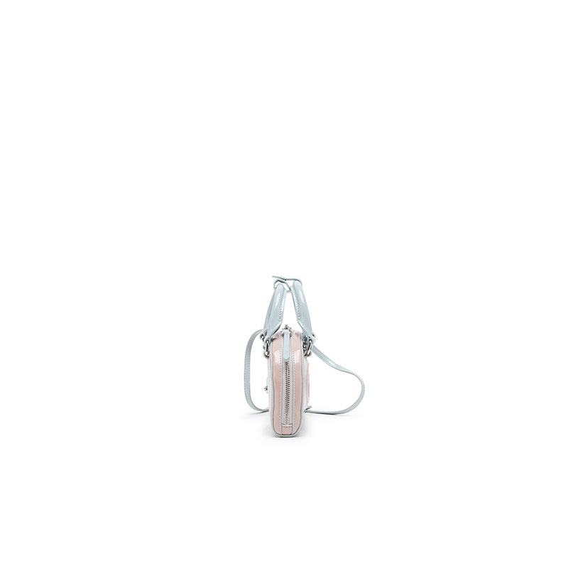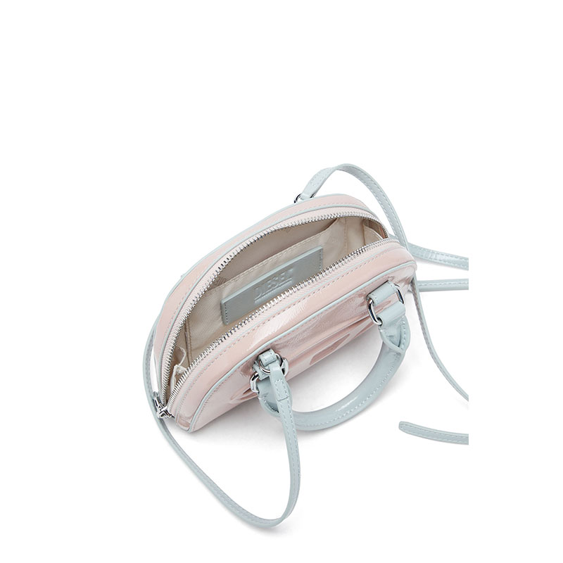 This women’s mini crossbody is a slimmer yet fully functional version of the ‘Dome’ bowling bag evolved from the iconic 1DR. Featuring an adjustable strap and rolled top handles, it embraces a playful colour-block design in PU. The fabric has the distinctive wrinkled texture and patent shine of naplak leather. The zipped compartment – roomy enough for your phone, card holder, keys and lipstick – opens wide, with side gussets keeping everything secure. Up front, an embossed Oval D is as bold as the bag.