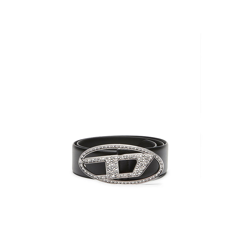 Women’s belt crafted from high-quality black leather, fastened with a crystal-encrusted metal Oval D buckle. Width: 4 cm / 1.5 inches.