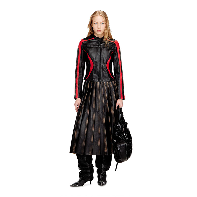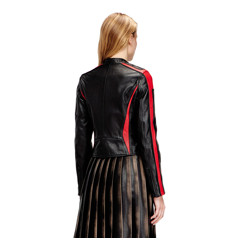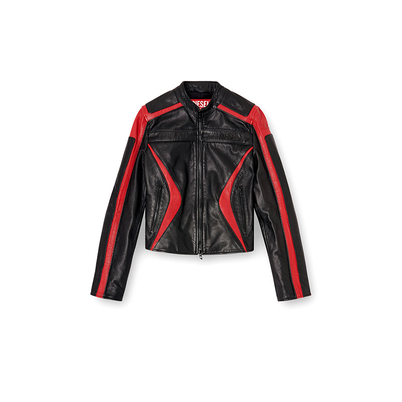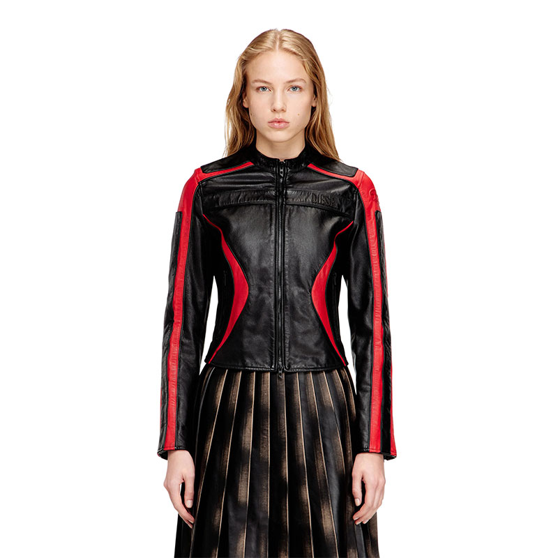 Modelled after racing styles, this women's moto jacket is colour-blocked from leather in a slim profile with classic metal zip hardware. An appliquéd Diesel logo accents the chest, while the iconic Oval D is embossed on the sleeve. The lining ensures smooth layering.
