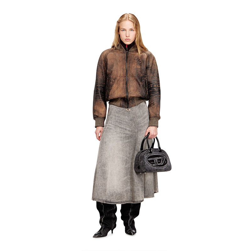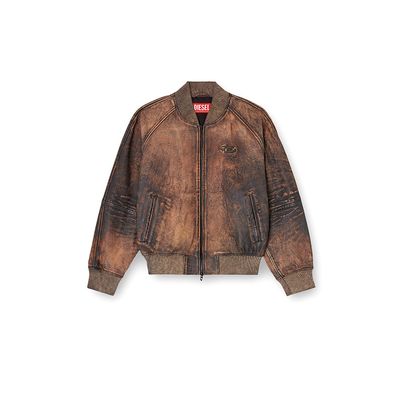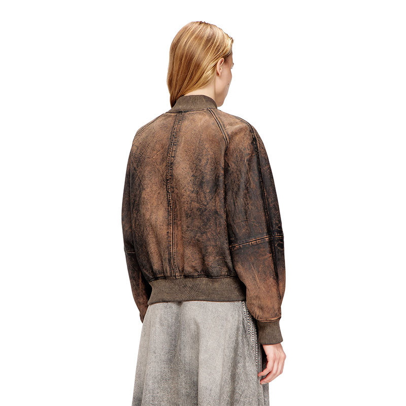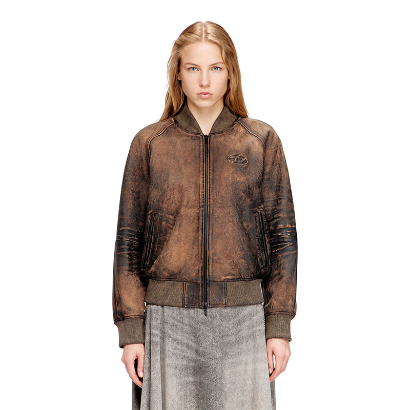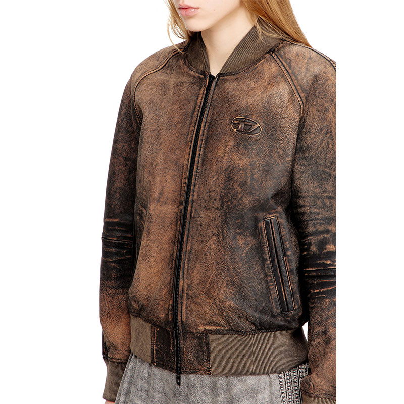 This women’s bomber jacket is crafted from hand-brushed leather, its rugged, worn-in patina perfectly replicated by the ribbed-knit trims. It fastens with a two-way zip and has a relaxed, raglan silhouette. An embossed Oval D logo at the chest signs off the monochrome distressed look.