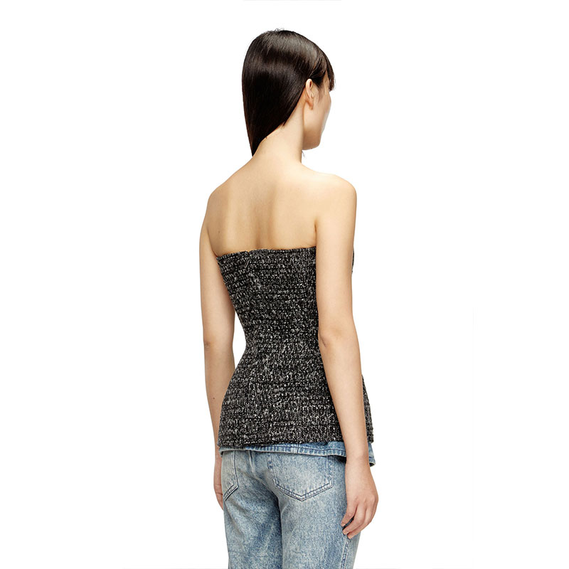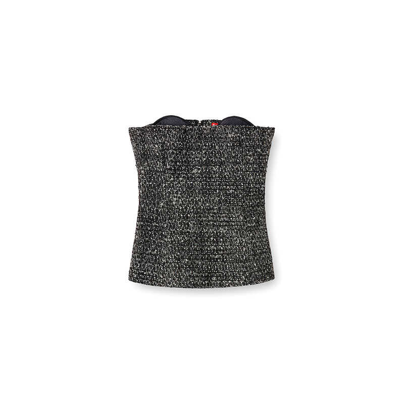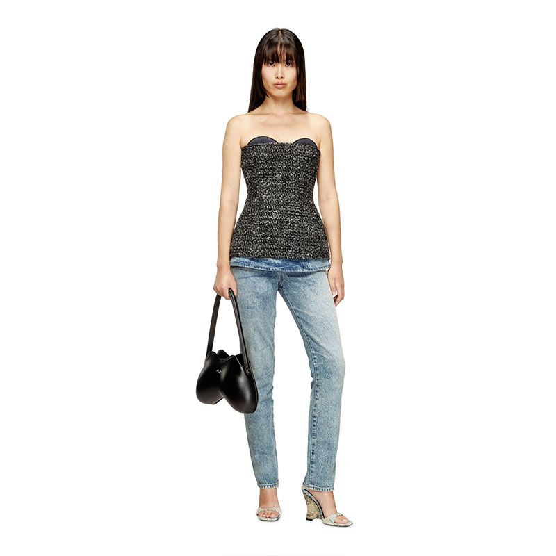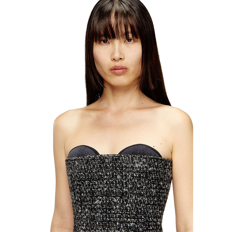This women's FW25 Runway Show basque is a Diesel take on severe tailoring. Stripped of almost all detail, it features a sharp, fitted-waist silhouette with a ultra-low neckline that cuts straight across the bust – the cups peeking out from beneath defy convention. Complete with a zip-fastening at the back.