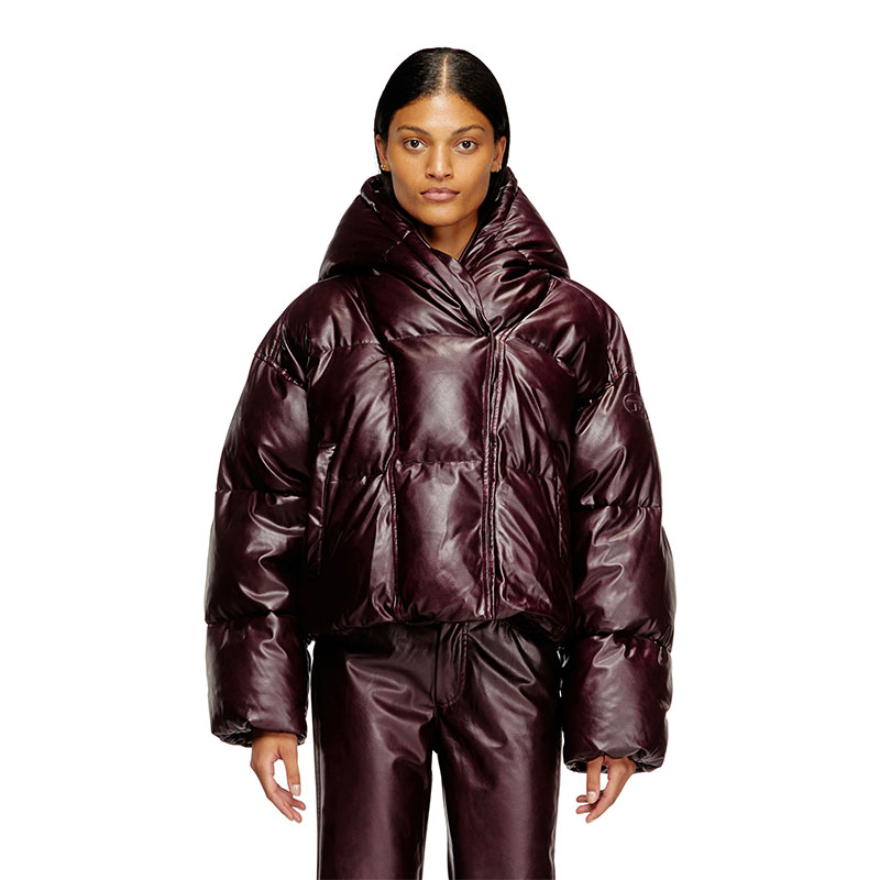 This women's puffer jacket is crafted from burgundy coated fabric, offering a unique, smooth texture that feels a bit like leather. It features a double-breasted construction with a hidden snap-button closure, a soft hood and drawstring cuffs for warmth. An embossed Oval D detail on the left sleeve subtly completes the design.