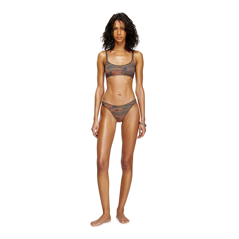 This women’s bikini top is made from recycled stretch fabric with a finely ribbed texture and utilitarian camouflage print. It has a sporty crop top shape and tiny peekaboo cut-outs created with the metallic Oval D logo on the front.