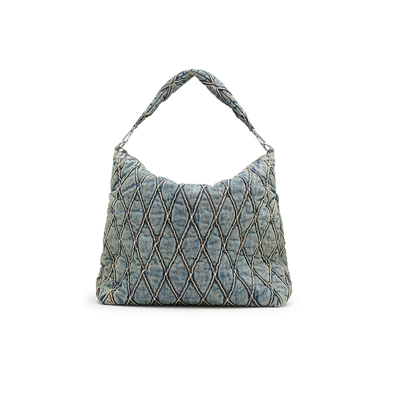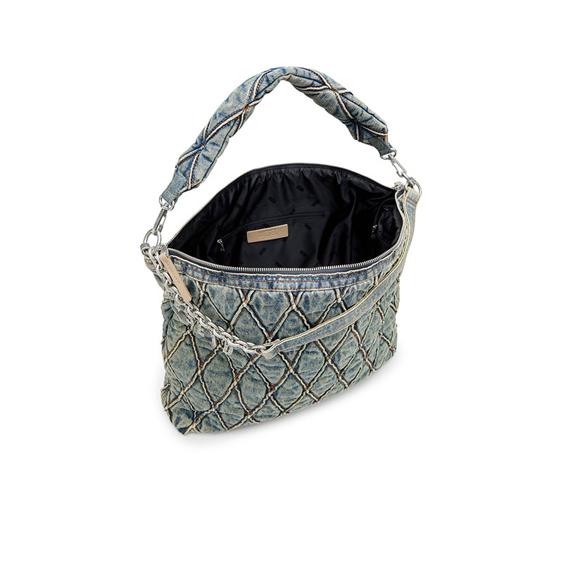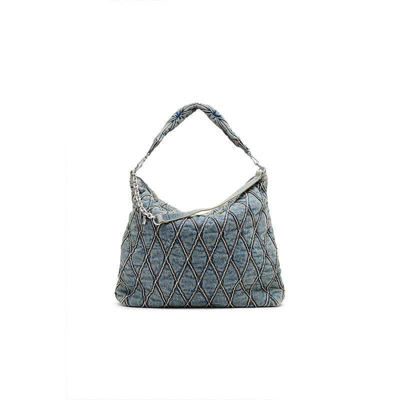 This women's hobo bag is particularly roomy, and can even fit a laptop. Made from dirty-wash denim quilted in a diamond pattern, one of Diesel's most recognisable and eye-catching textures, it features a matching padded handle to carry the bag under the shoulder. The additional short strap can be used as a double handle or draped across the front of the bag for decoration – the chain is adorned with crystal-studded logo lettering.
