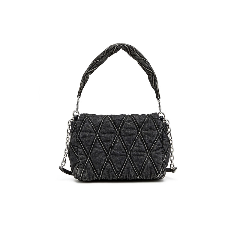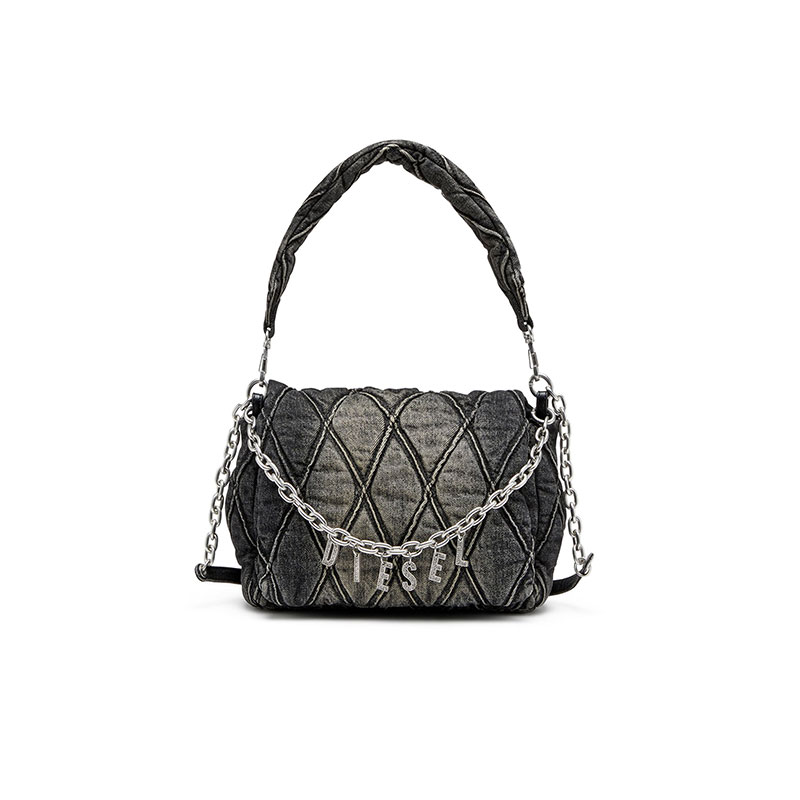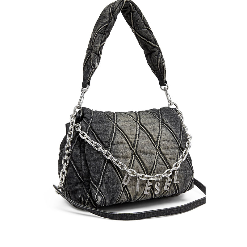 This women's handbag is made from quilted black denim with a treated finish. The front flap opens up to a single compartment with an internal zipped pocket. The bag features a soft denim handle and a longer denim and chain strap in matte silver-tone metal, adorned with rhinestone Diesel letter charms that can be draped across the front. The chain also doubles as a bracelet.