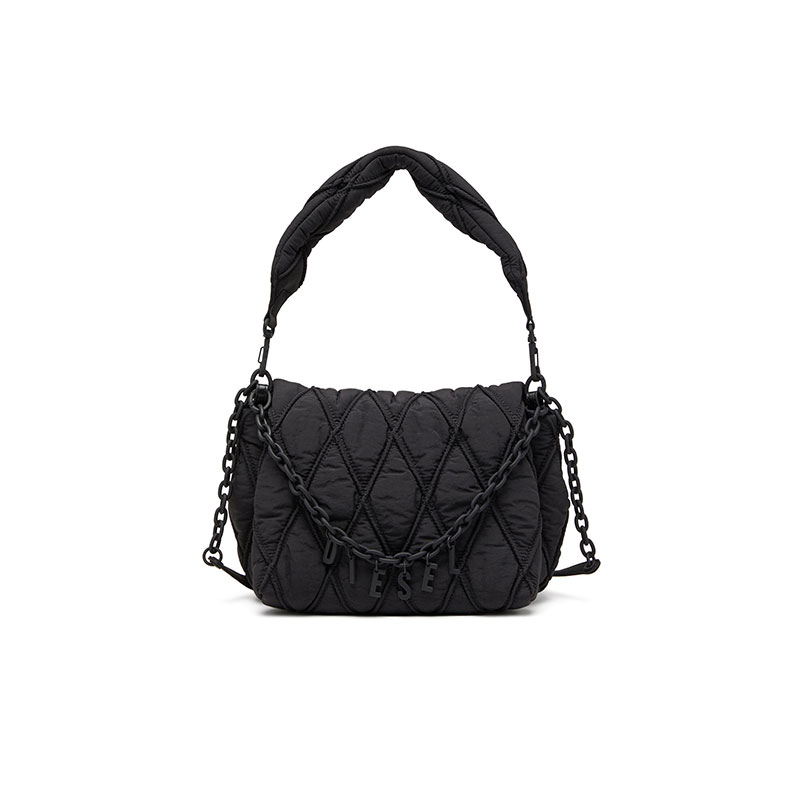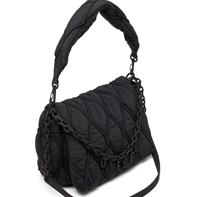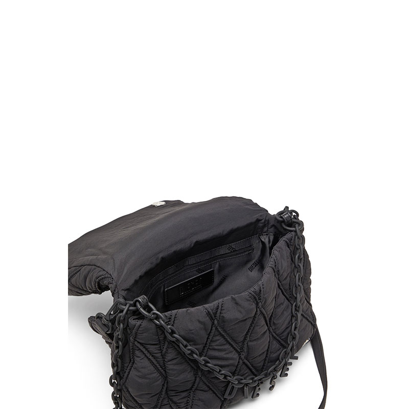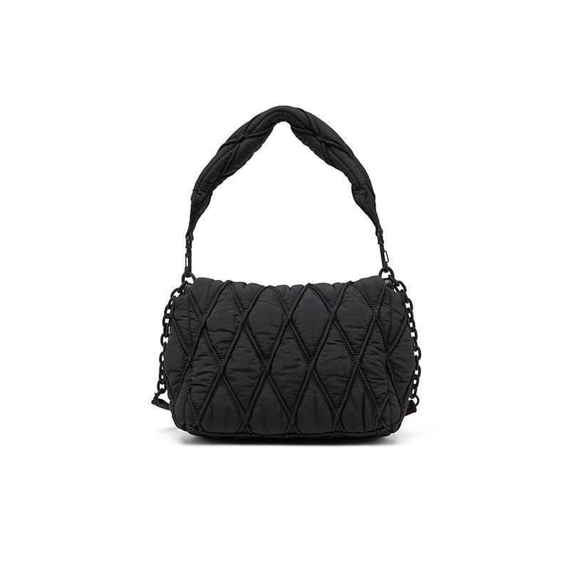 A tonal design informed by utility and chain play. This women's shoulder bag has a softly padded, wrinkled-nylon construction, quilted and stitched in argyle diamonds. A matte rubberised chain with dangling logo charms drapes over the flap, adding a playful touch – the accessory also doubles as a necklace or bracelet. Experiment with the detachable straps to suit your style.