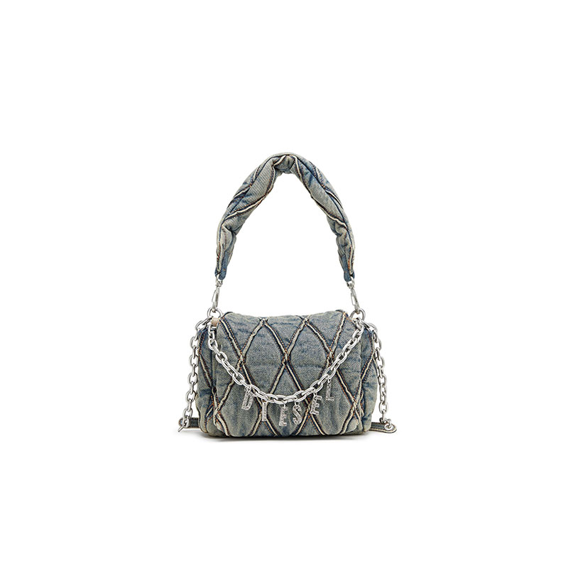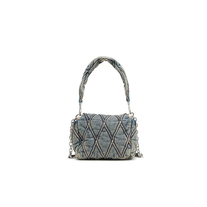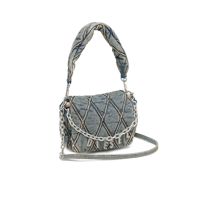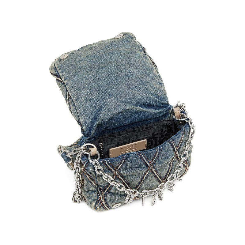 Compact women's handbag made from quilted light blue denim, topped with a matching handle. The accessory features a flap closure, an internal zipped pocket, and a metal Diesel lettering chain.