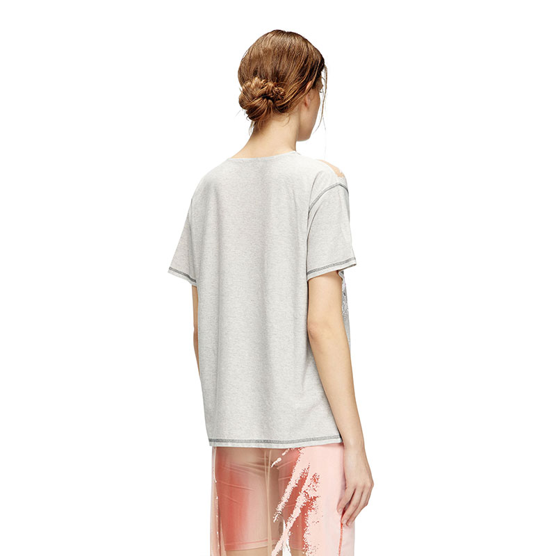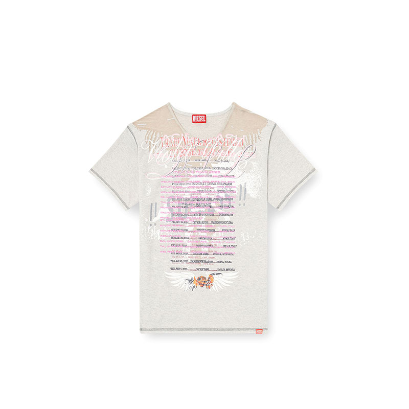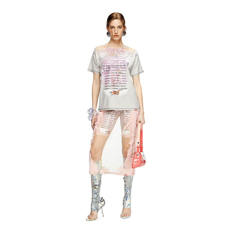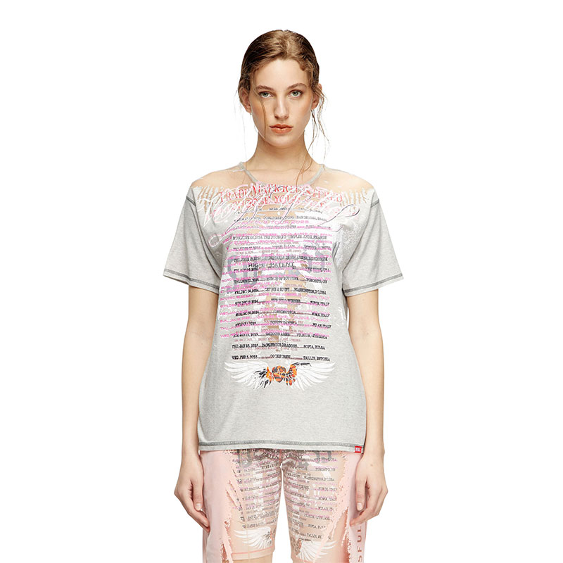 This women's jersey T-shirt features a sheer distressed effect on the front, reminiscent of Diesel's iconic dévoré looks. Part of the Remaster collection, a celebration of the underground club scene and Diesel's long-standing alliance with the DJ community, this tee is printed with custom graphics.