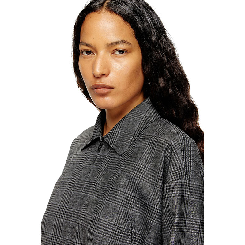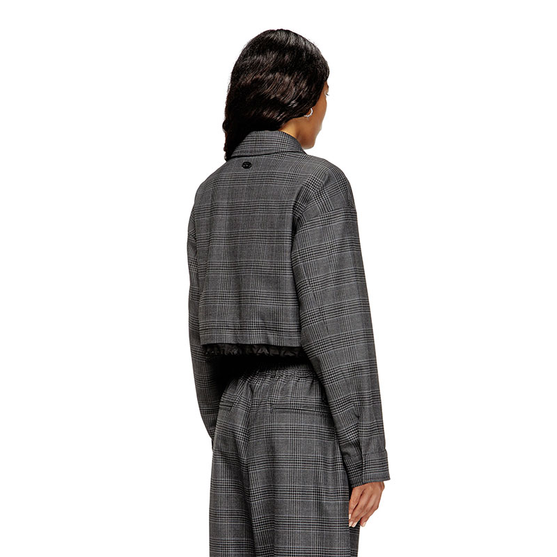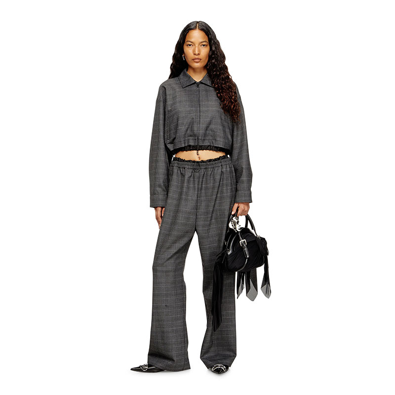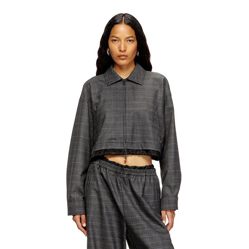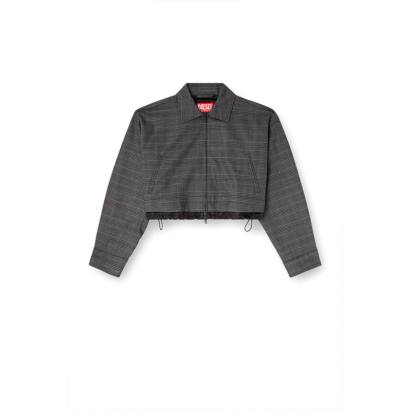 Subverting tradition and playing with archetypes stand as pillars of Diesel's design language. The notions come to life in this women’s jacket that juxtaposes a classic tailoring fabric with a sporty silhouette and technical elements. A cropped, boxy riff on a coach style, it’s made from a wool blend woven with Prince of Wales checks and has a drawstring hem in technical nylon satin.