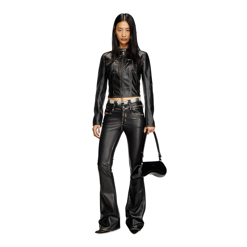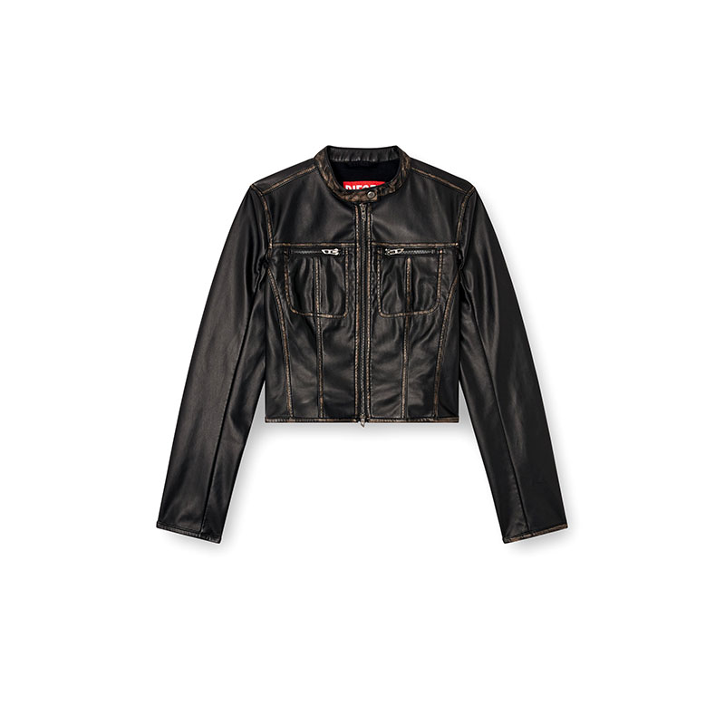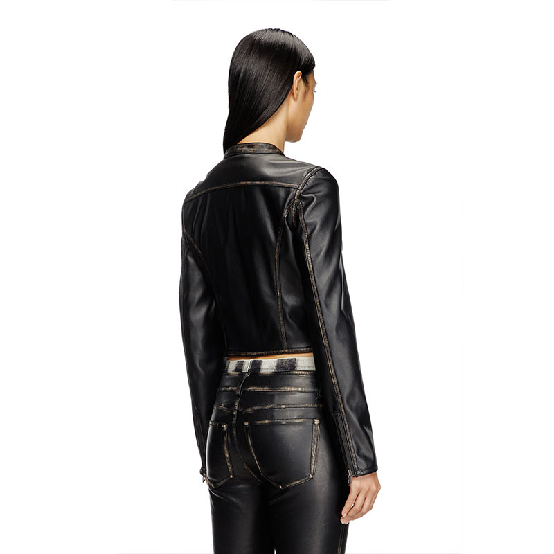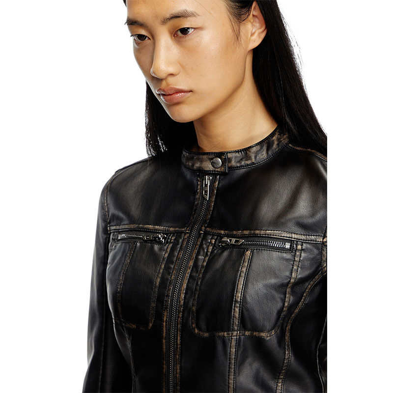 This women’s cropped biker jacket has a slim snap-fastening collar and pocketed front inspired by trucker styles. Designed for a regular fit, it’s crafted from supple synthetic material and faded along the seams to give it the patina of a well-worn piece.