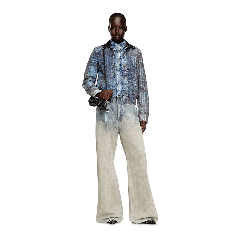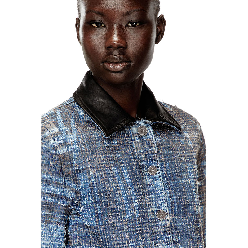 Women's jacket cut to a slightly cropped silhouette with a fitted back hem and a contrasting leather collar. Defined by a graphic, tactile look, this medium blue wash is made from organic-cotton fix denim. The bouclé texture is crafted using an elaborate needlepunch technique, lending the fabric a uniquely distressed finish. Enriched with a Prince of Wales print, it's a perfect example of Diesel's alternative vision of classic tailoring staples.