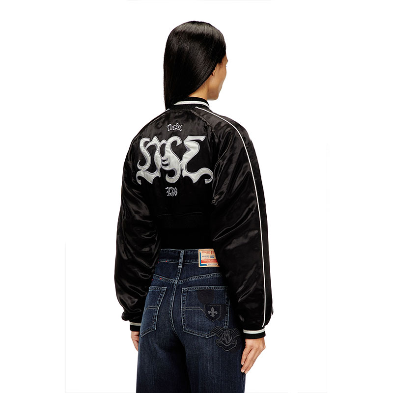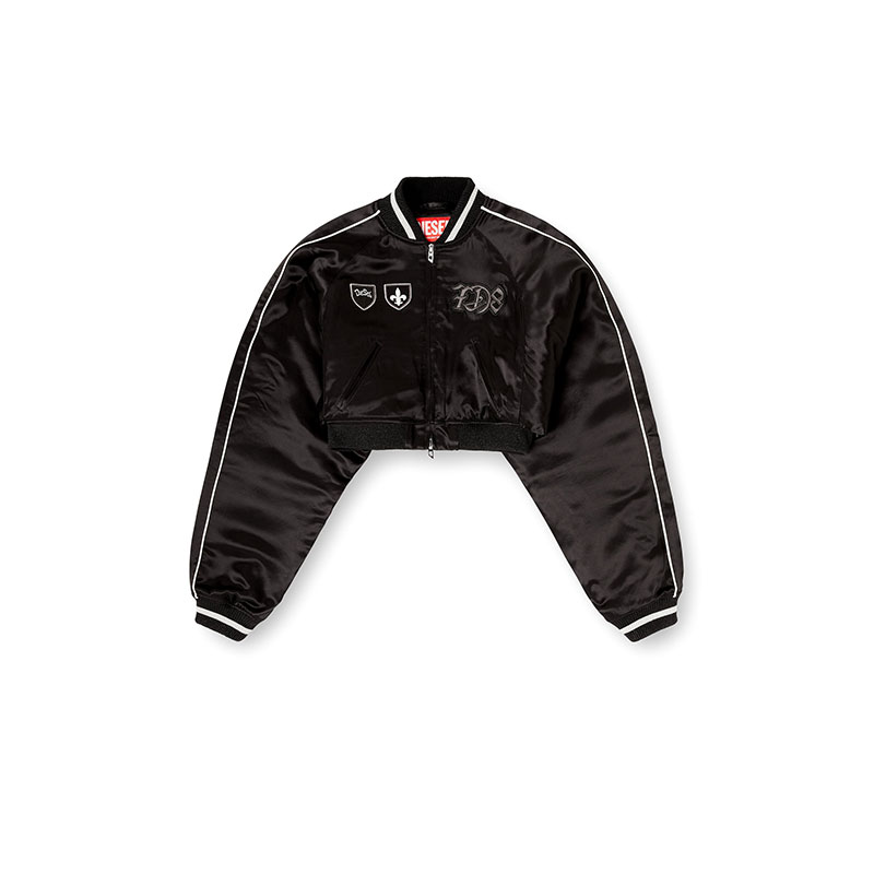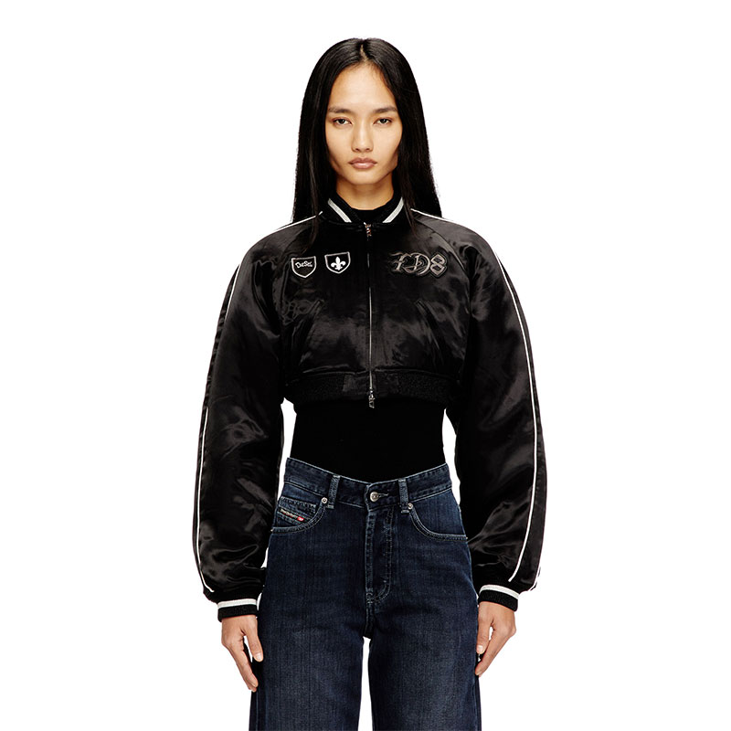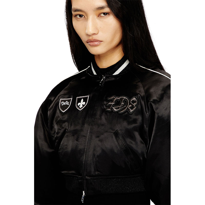 This women's satin bomber jacket features a cropped silhouette, accented with ribbed trims and contrast piping on the sleeves. Featuring a lightly padded internal lining, the jacket features signature DSL patches and embroideries on the front and back.