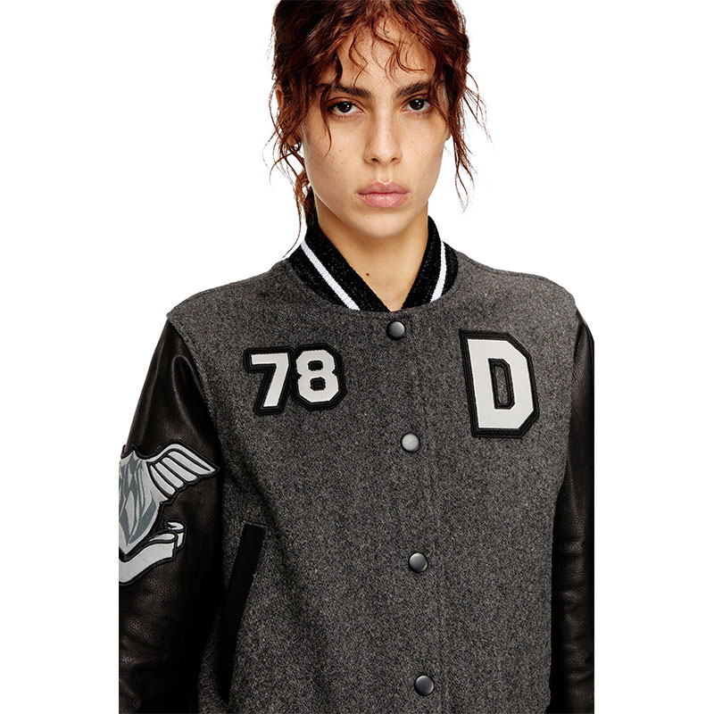 Women's cropped varsity jacket crafted from a wool blend and embellished with a Phoenix embroidery and multiple logo-inspired patches on the front, back, and on the leather sleeves. Complete with ribbed neck and cuffs, wool patches, and a lightly padded satin lining.