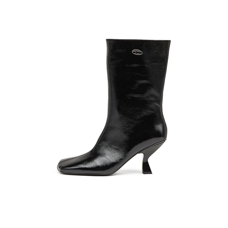 These women’s ankle boots feature a contemporary square-toe silhouette and 7.5 cm heels with a sculpturally angled profile. The naplak-effect upper is shiny and crinkled, defined by the column-like pull-on shaft. Finished with a subtle Oval D plaque – a logo distilled to essence.