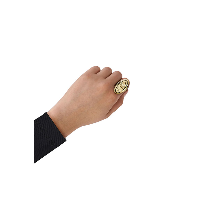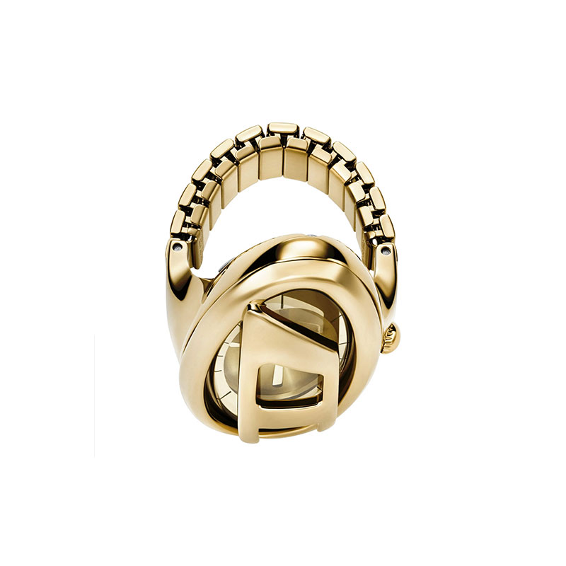 Diesel's 19mm D-Era ring watch features a gold-tone sunray dial, two-hand movement, and a gold-tone stainless steel stretchable ring band attachment.