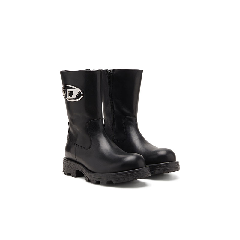 Rugged with a touch of polish, these women’s biker boots are crafted from shiny black leather with wide, zip-fastening shafts showcasing gleaming silver Oval D hardware – the plaque is inserted into a cut-out, creating a peekaboo effect. The lug soles will keep you surefooted on any terrain.