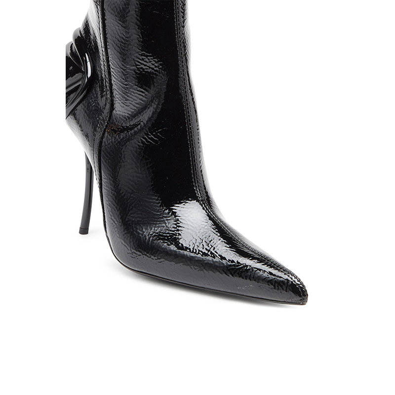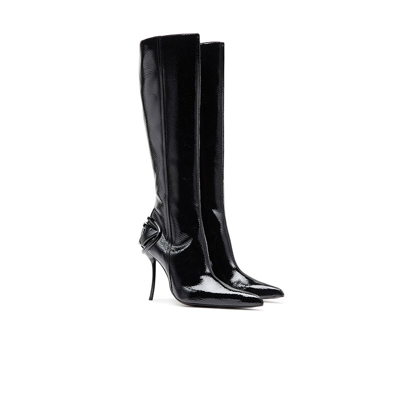 Designed with sharply pointed toes, these women's knee boots feature a distinctive wrinkled texture and glossy finish. Sleek Oval D hardware wraps the back of the shoe and merges with the elegantly curved heel – this stiletto offers 105mm of lift. Side zips ensure they're easy to slip on and off.